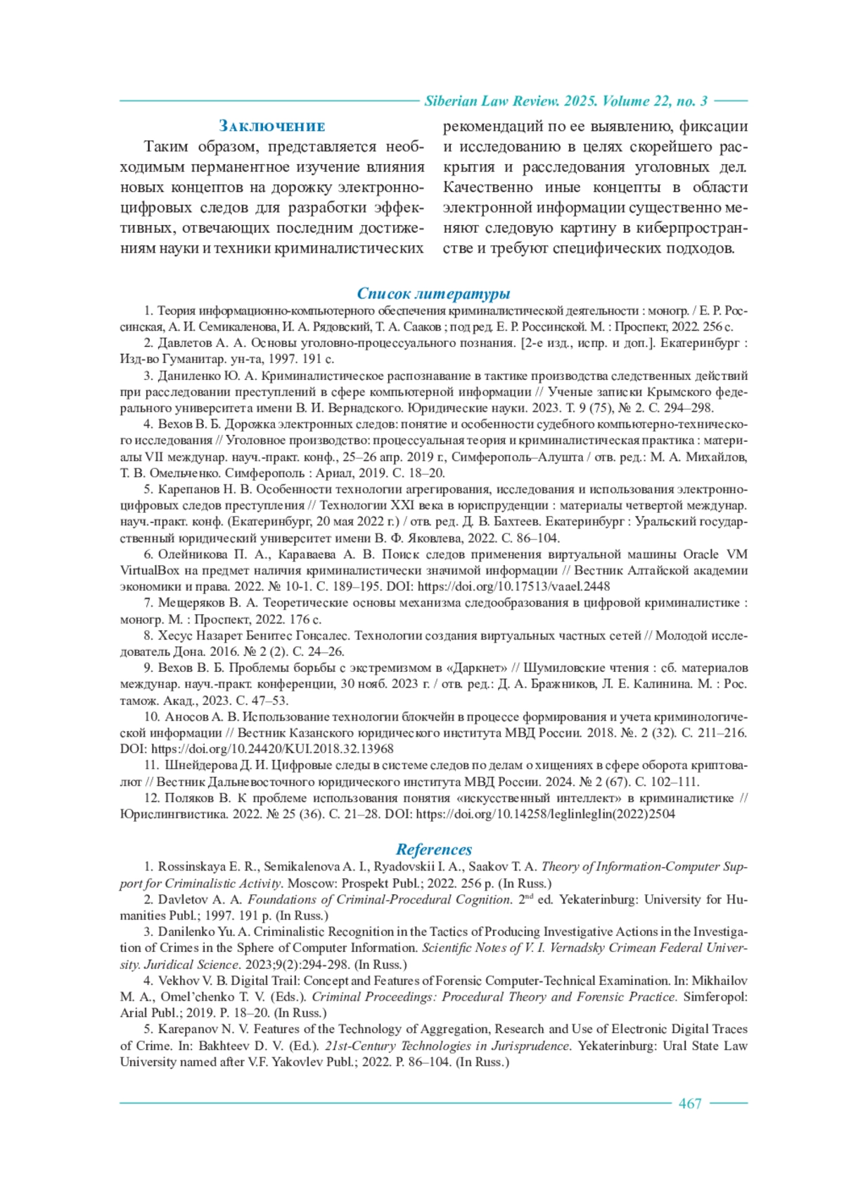 7. Мещеряков В. А. Теоретические основы механизма следообразования в цифровой криминалистике : моногр. М. : Проспект, 2022. 176 с.