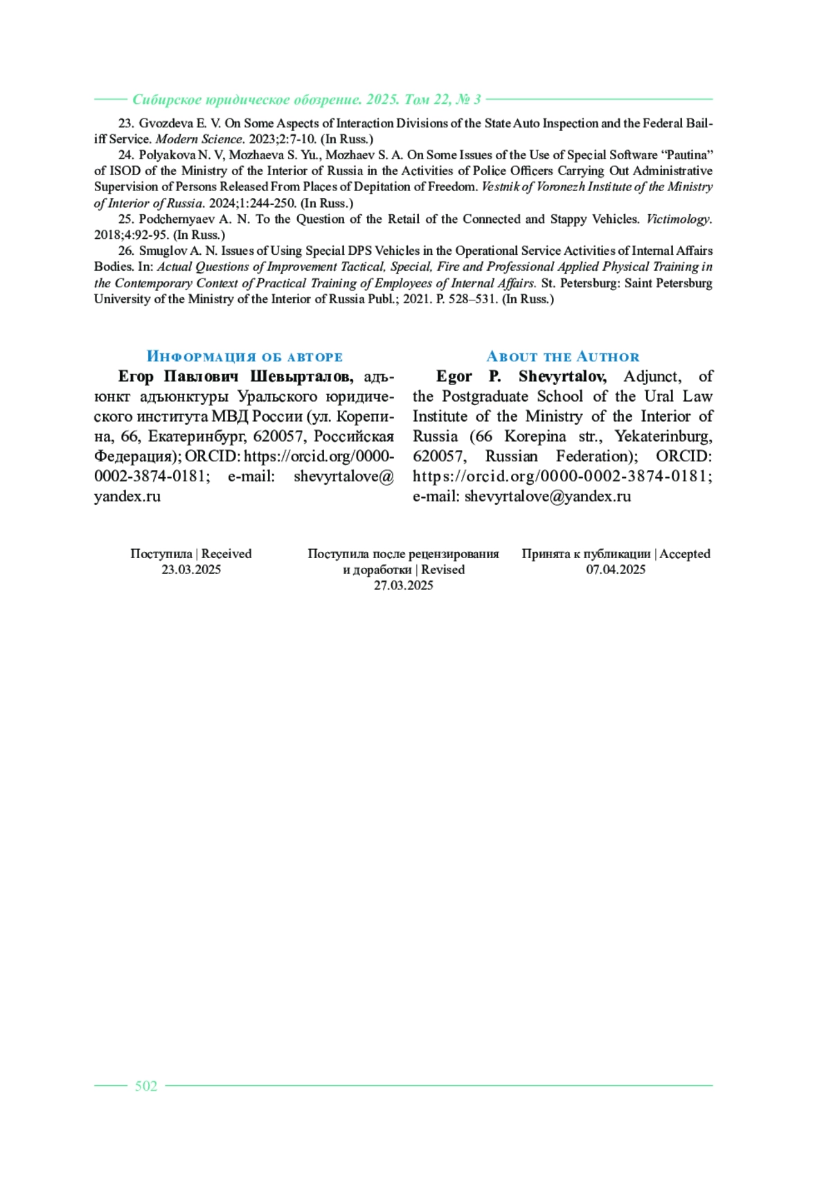 24. Смуглов А. Н. Проблематика использования специальных автомобилей ДПС в оперативно-служебной деятельности органов внутренних дел // Актуальные вопросы совершенствования тактико-специальной, огневой и профессионально-прикладной физической подготовки в современном контексте практического обучения сотрудников органов внутренних дел : материалы междунар. науч.-практ. конф., Санкт-Петербург, 21-22 мая 2021 г. СПб. : С.-Петерб. ун-т МВД России, 2021. С. 528-531.