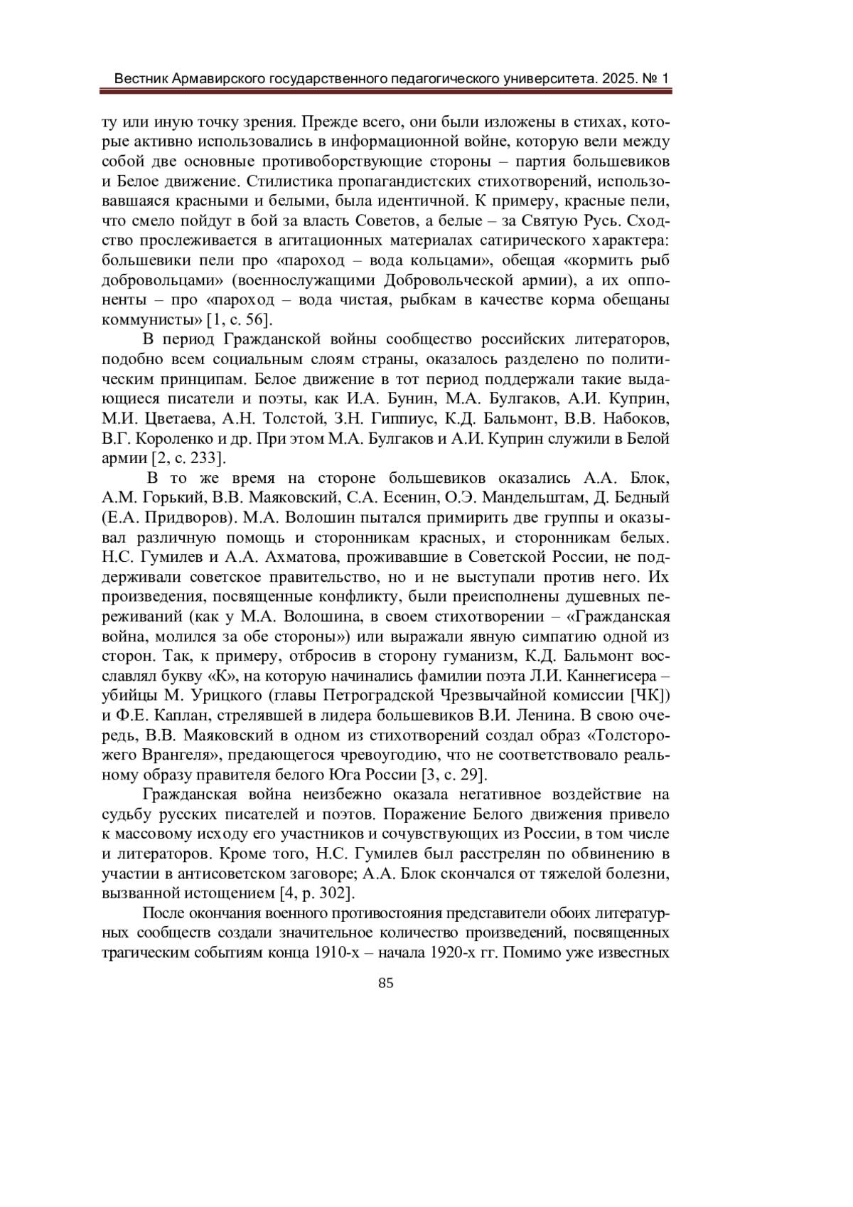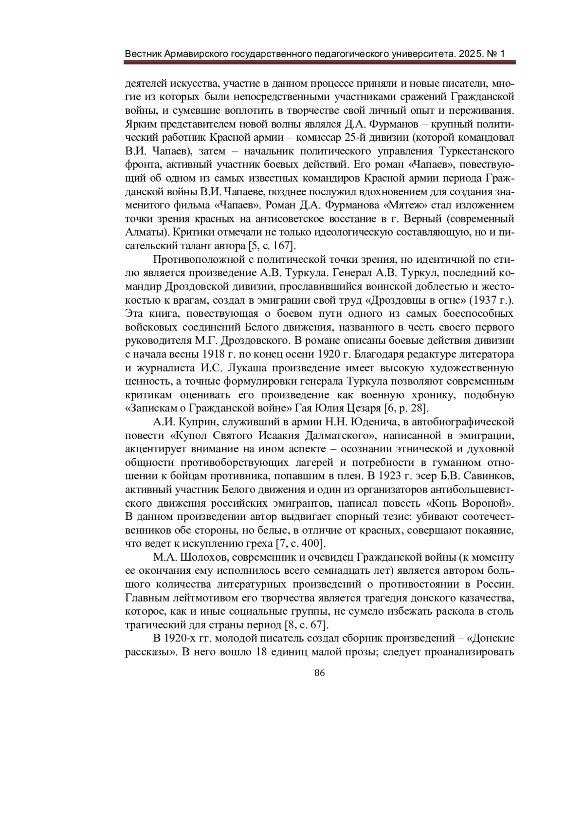 1. Бабичева, Ю. В. Гражданская война в России начала XX века в зеркалах отечественной литературы / Ю. В. Бабичева. - Текст: непосредственный // Вестник Череповецкого государственного университета. - 2012. - № 2. - Том 2. - С. 54-58. EDN: PCDGVR