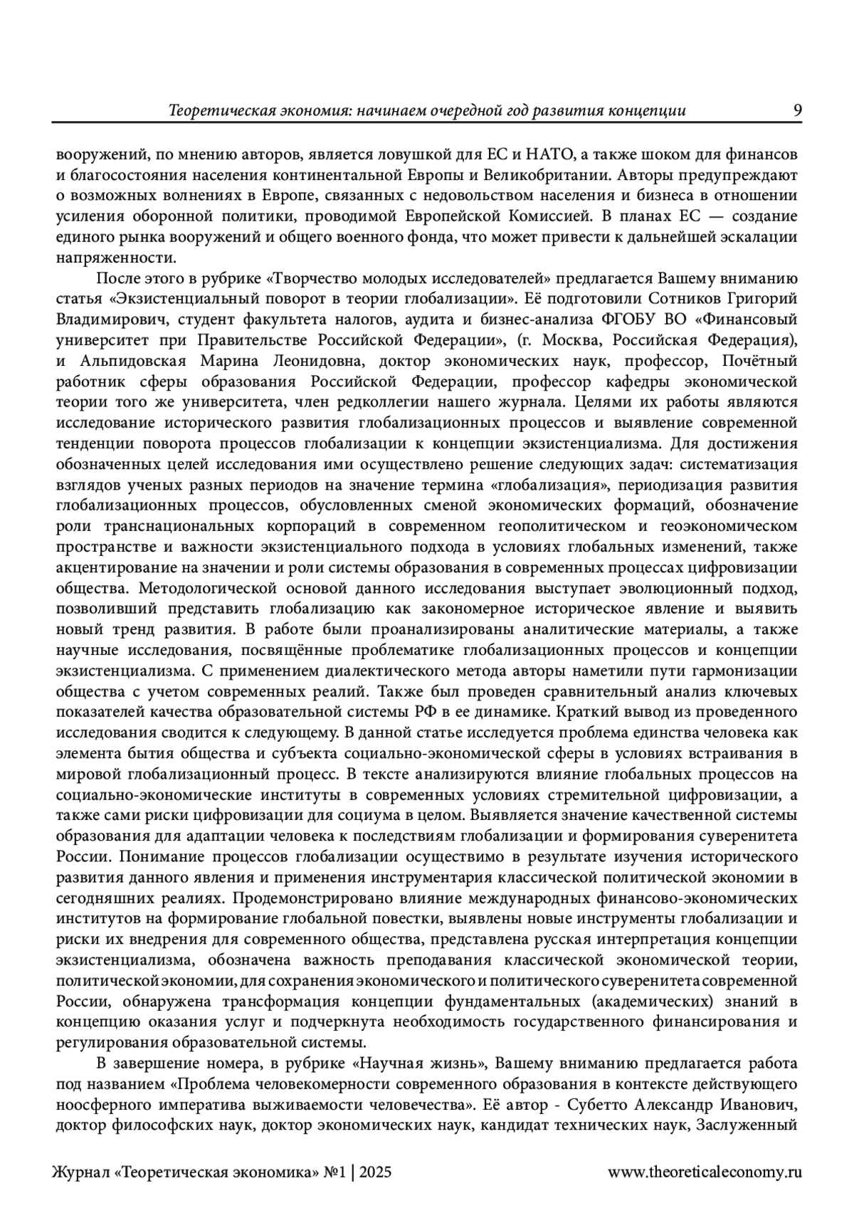 Целью исследования является анализ исторической эволюции процессов глобализации и выявление современной тенденции их трансформации в контексте экзистенциалистской концепции. Для достижения обозначенных целей исследования предполагается решение следующих задач: систематизация взглядов ученых разных периодов на значение термина «глобализация», периодизация развития глобализационных процессов, обусловленных сменой экономических формаций, обозначение роли транснациональных корпораций в современном геополитическом и геоэкономическом пространстве и важности экзистенциального подхода в условиях глобальных изменений, также акцентирование на значении и роли системы образования в современных процессах цифровизации общества. Методологической основой данного исследования выступает эволюционный подход, позволивший представить глобализацию как закономерное историческое явление и выявить новый тренд развития. В работе были проанализированы аналитические материалы, а также научные исследования, посвящённые проблематике глобализационных процессов и концепции экзистенциализма. С применением диалектического метода авторы наметили пути гармонизации общества с учетом современных реалий. Также был проведен сравнительный анализ ключевых показателей качества образовательной системы РФ в ее динамике. В данной статье исследуется проблема единства человека как элемента бытия общества и субъекта социально-экономической сферы в условиях встраивания в мировой глобализационный процесс. В тексте анализируются влияние глобальных процессов на социально-экономические институты в современных условиях стремительной цифровизации, а также сами риски цифровизации для социума в целом. Выявляется значение качественной системы образования для адаптации человека к последствиям глобализации и формирования суверенитета России. Понимание процессов глобализации осуществимо в результате изучения исторического развития данного явления и применения инструментария классической политической экономии в сегодняшних реалиях. Продемонстрировано влияние международных финансово-экономических институтов на формирование глобальной повестки, выявлены новые инструменты глобализации и риски их внедрения для современного общества, представлена русская интерпретация концепции экзистенциализма, обозначена важность преподавания классической экономической теории политической экономии для сохранения экономического и политического суверенитета современной России, обнаружена трансформация концепции фундаментальных (академических) знаний в концепцию оказания услуг и подчеркнута необходимость государственного финансирования и регулирования образовательной системы.