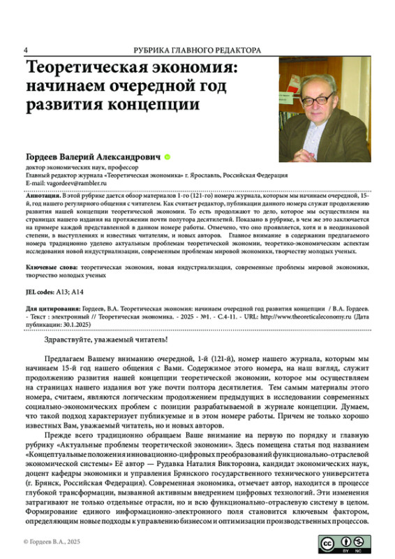 В этой рубрике дается обзор материалов 1-го (121-го) номера журнала, которым мы начинаем очередной, 15-й, год нашего регулярного общения с читателем. Как считает редактор, публикации данного номера служат продолжению развития нашей концепции теоретической экономии. То есть продолжают то дело, которое мы осуществляем на страницах нашего издания на протяжении почти полутора десятилетий. Показано в рубрике, в чем же это заключается на примере каждой представленной в данном номере работы. Отмечено, что оно проявляется, хотя и в неодинаковой степени, в выступлениях и известных читателям, и новых авторов. Главное внимание в содержании предлагаемого номера традиционно уделено актуальным проблемам теоретической экономии, теоретико-экономическим аспектам исследования новой индустриализации, современным проблемам мировой экономики, творчеству молодых ученых.