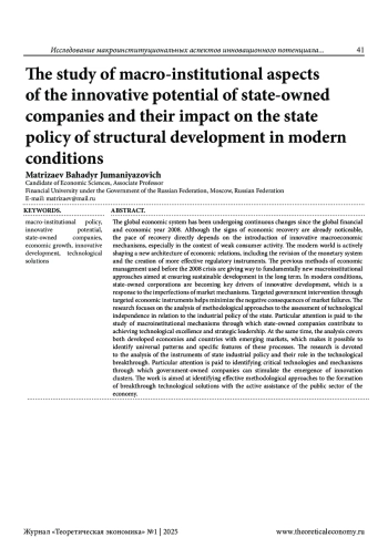 Глобальная экономическая система претерпевает непрерывные изменения с момента мирового финансово-экономического кризиса 2008 года. Хотя признаки оживления экономики уже заметны, темпы восстановления в долгосрочном периоде напрямую зависят от внедрения инновационных макроэкономических механизмов, особенно в условиях слабой потребительской активности. Современный мир активно формирует новую архитектуру экономических взаимоотношений, включая пересмотр валютной системы и создание более эффективных регуляторных инструментов. Прежние методы управления экономикой, применявшиеся до кризиса 2008 года, уступают место принципиально новым макроинституциональным подходам, направленным на обеспечение устойчивого развития в долгосрочной перспективе. В современных условиях государственные корпорации становятся ключевыми драйверами инновационного развития, что является ответом на несовершенства рыночных механизмов. Точечное государственное вмешательство через целенаправленные экономические инструменты позволяет минимизировать негативные последствия рыночных провалов. Данное исследование направлено на анализ методологических подходов к оценке технологической независимости во взаимосвязи с промышленной политикой государства. Особое внимание уделяется изучению макроинституциональных механизмов, посредством которых госкомпании способствуют достижению технологического превосходства и стратегического лидерства. При этом анализ охватывает как развитые экономики, так и страны с развивающимися рынками, что позволяет выявить универсальные закономерности и специфические особенности данных процессов. Исследование также посвящено анализу инструментов государственной промышленной политики и их роли в технологическом прорыве. Особое внимание уделяется определению критически важных технологий и механизмов, через которые компании с государственным участием могут стимулировать появление инновационных кластеров. В целом, настоящая статья направлена на выявление эффективных методологических подходов к формированию прорывных технологических решений при активном содействии государственного сектора экономики