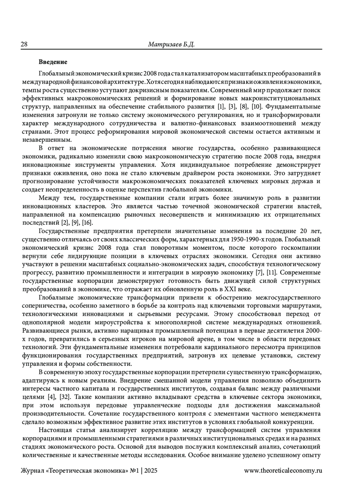 6. Матризаев Б.Д. БРИКСЭЛЕВЕНомика: исследование принципов формирования неоглобального равновесия и экономического роста. Теоретическая экономика. - 2022 - №10. - с.115-131. ;. DOI: 10.52957/22213260_2022_10_115 EDN: OWSMXH