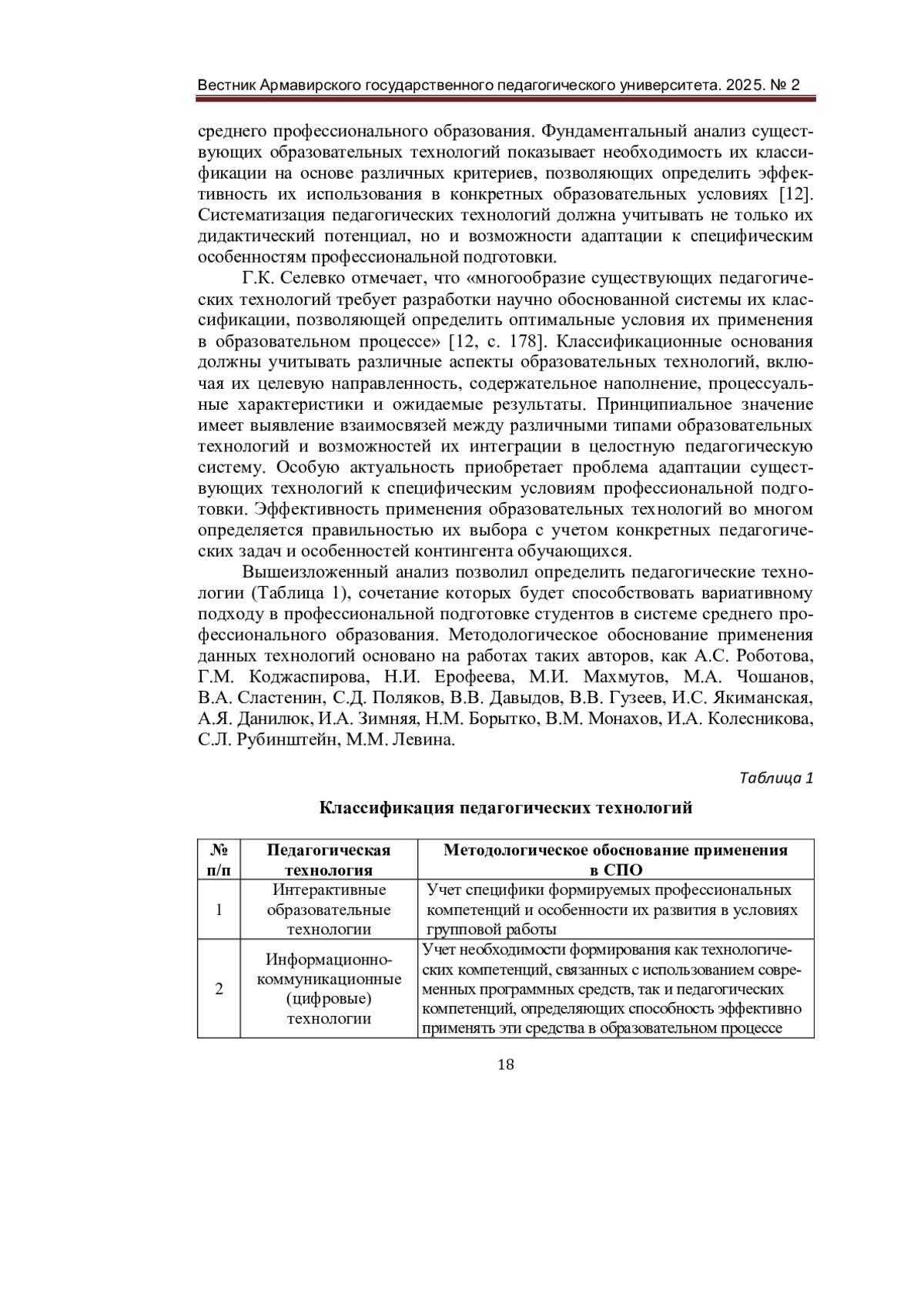 Современная система среднего профессионального образования (далее СПО) находится в процессе активной модернизации, что обусловлено необходимостью подготовки компетентных специалистов, способных эффективно решать профессиональные задачи в динамично меняющихся условиях. Гибкость и мобильность образовательного пространства, создаваемого в современных профессиональных образовательных организациях, внедрение инновационных механизмов и передовых практик позволяют достигать высокого качества подготовки будущих специалистов, оперативно отзываться на запросы работодателей, ориентиры государственной образовательной политики и ожидания потребителей услуг. В данной статье рассматриваются подходы к определению понятия «образовательные технологии», определена модель организационно-педагогических условий внедрения вариативного подхода в использовании образовательных технологий в системе среднего профессионального образования.