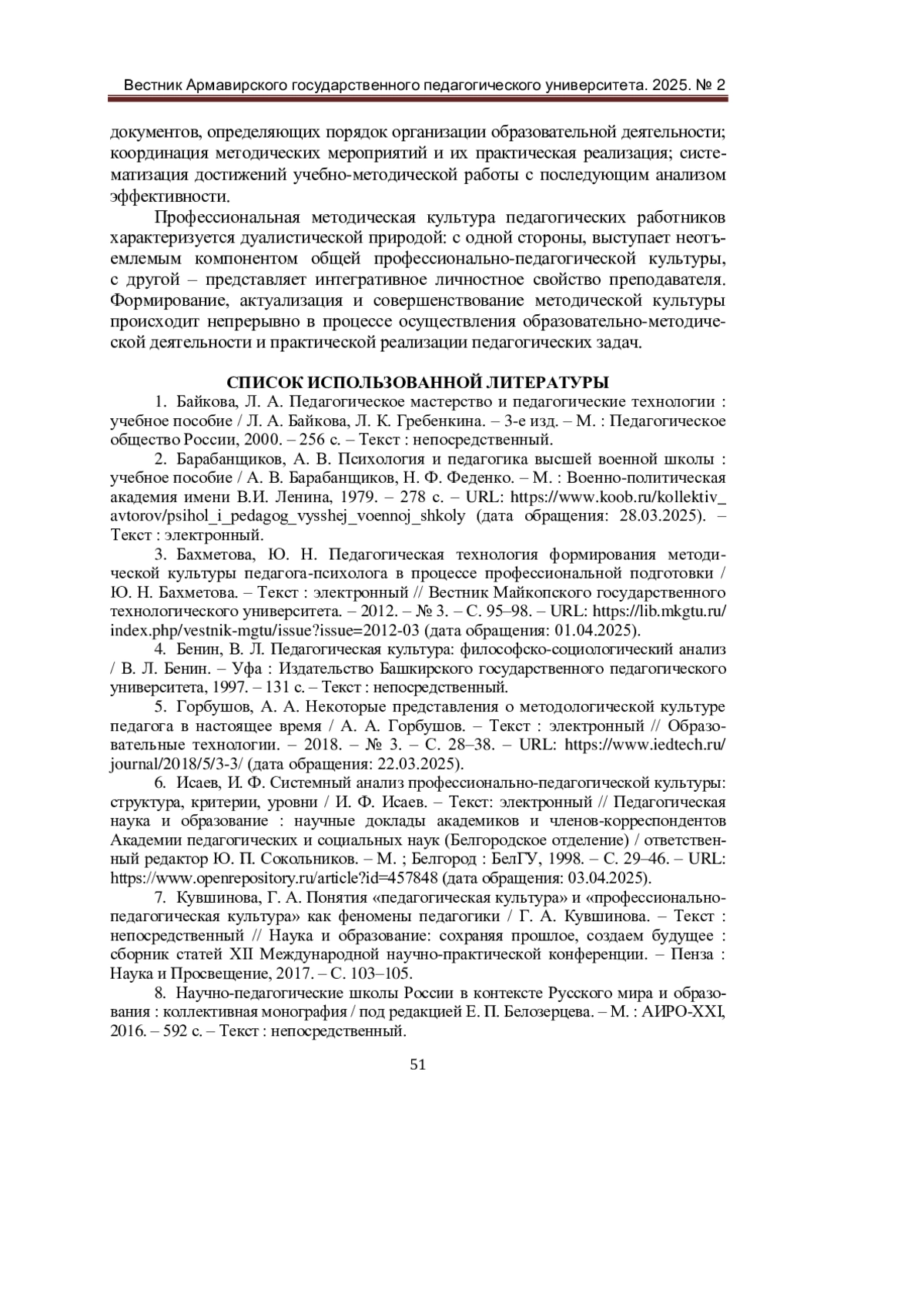 4. Бенин, В. Л. Педагогическая культура: философско-социологический анализ / В. Л. Бенин. - Уфа: Издательство Башкирского государственного педагогического университета, 1997. - 131 с. - Текст: непосредственный.
