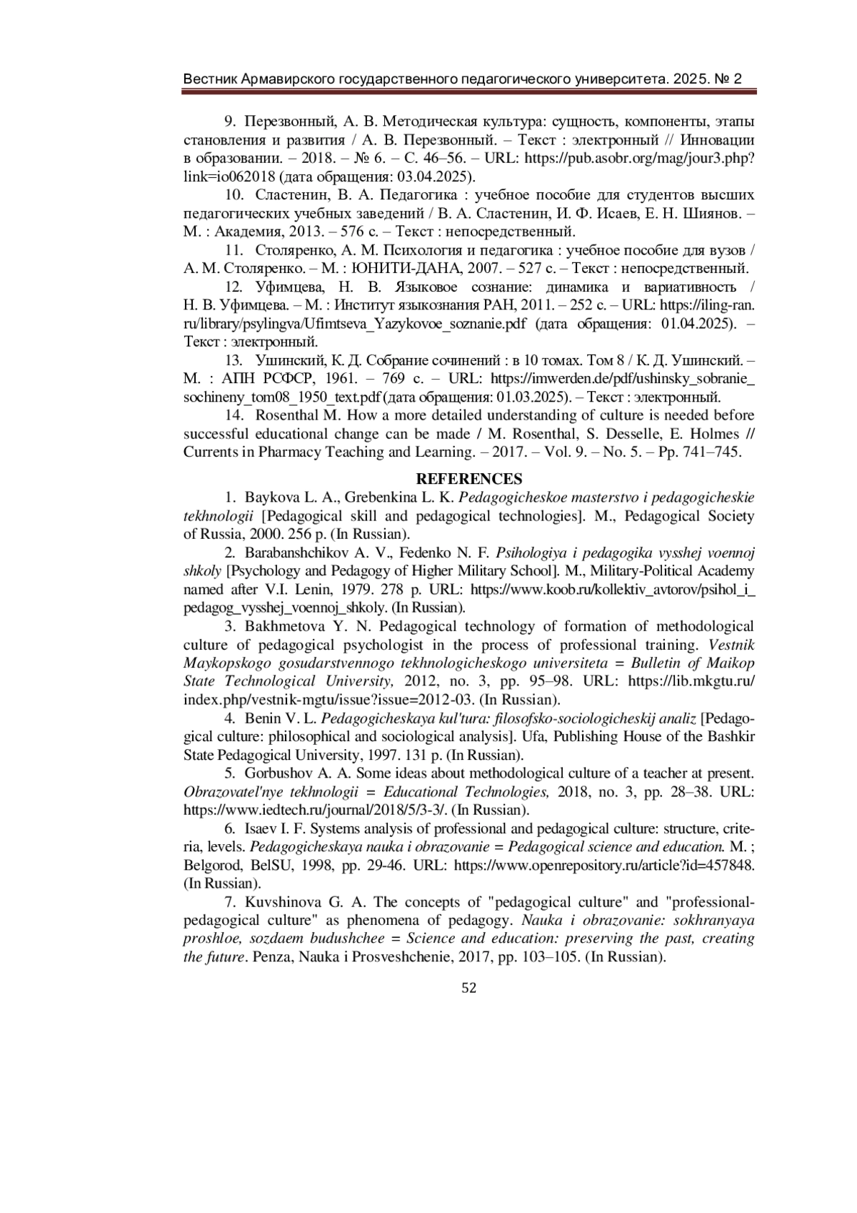 5. Горбушов, А. А. Некоторые представления о методологической культуре педагога в настоящее время / А. А. Горбушов. - Текст: электронный // Образовательные технологии. - 2018. - № 3. - С. 28-38. - URL: https://www.iedtech.ru/journal/2018/5/3-3/(дата обращения: 22.03.2025).