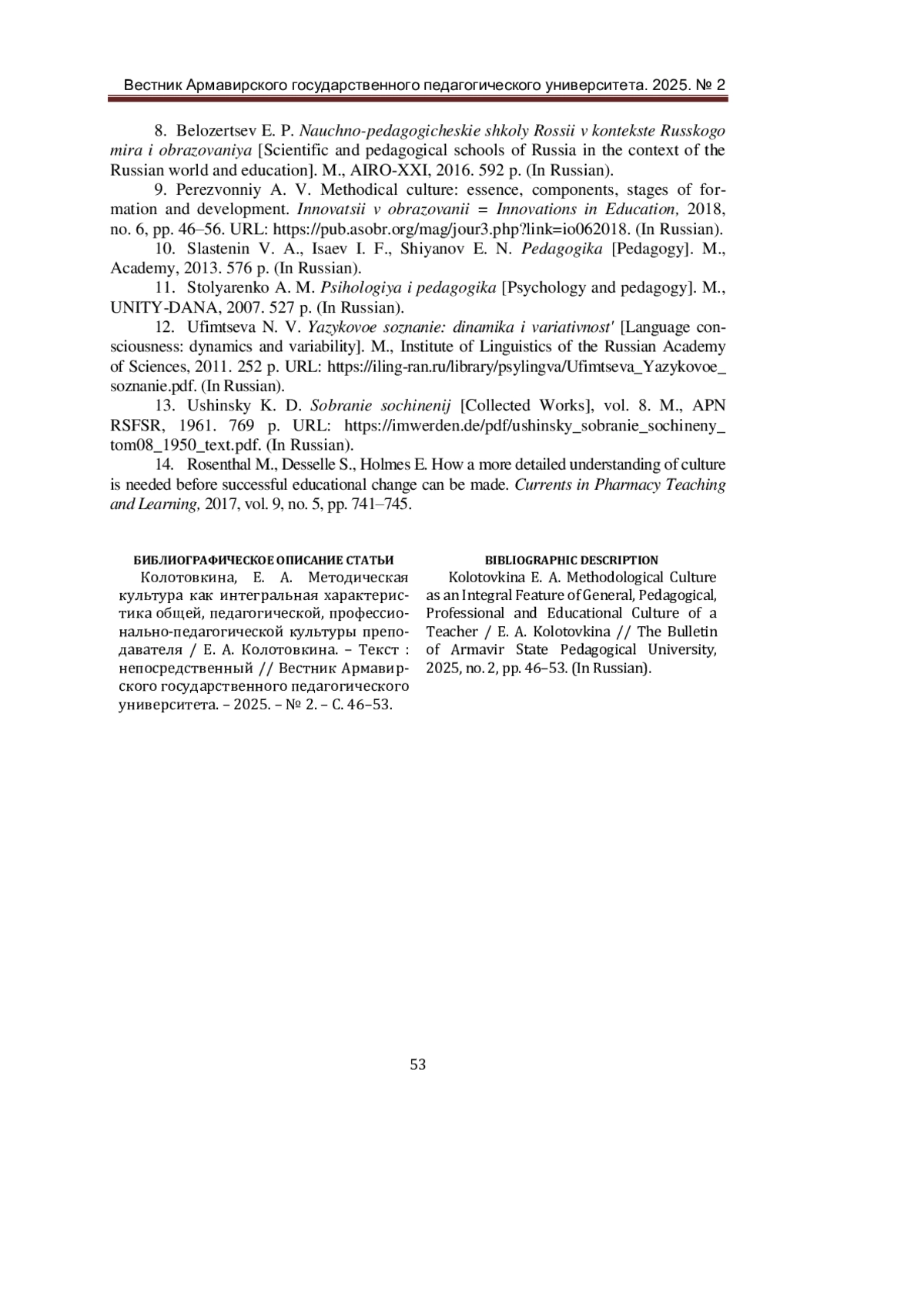 9. Перезвонный, А. В. Методическая культура: сущность, компоненты, этапы становления и развития / А. В. Перезвонный. - Текст: электронный // Инновации в образовании. - 2018. - № 6. - С. 46-56. - URL: https://pub.asobr.org/mag/jour3.php?link=io062018 (дата обращения: 03.04.2025).