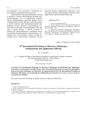 2. Book of abstracts of the X International Workshop on Microwave discharges: Fundamentals and Applications. (Mosvow, Yanus-K, 2018), pp. 73.