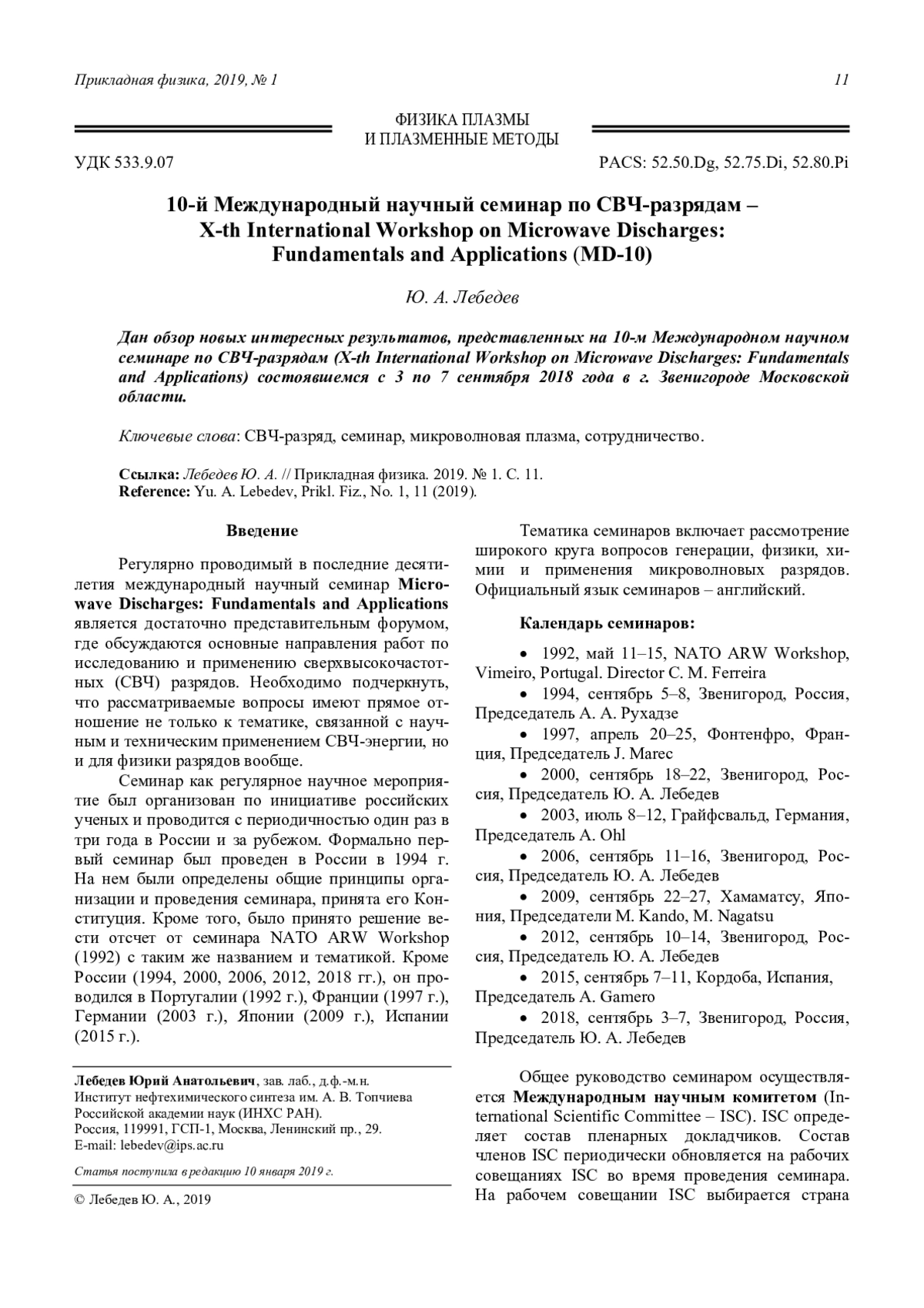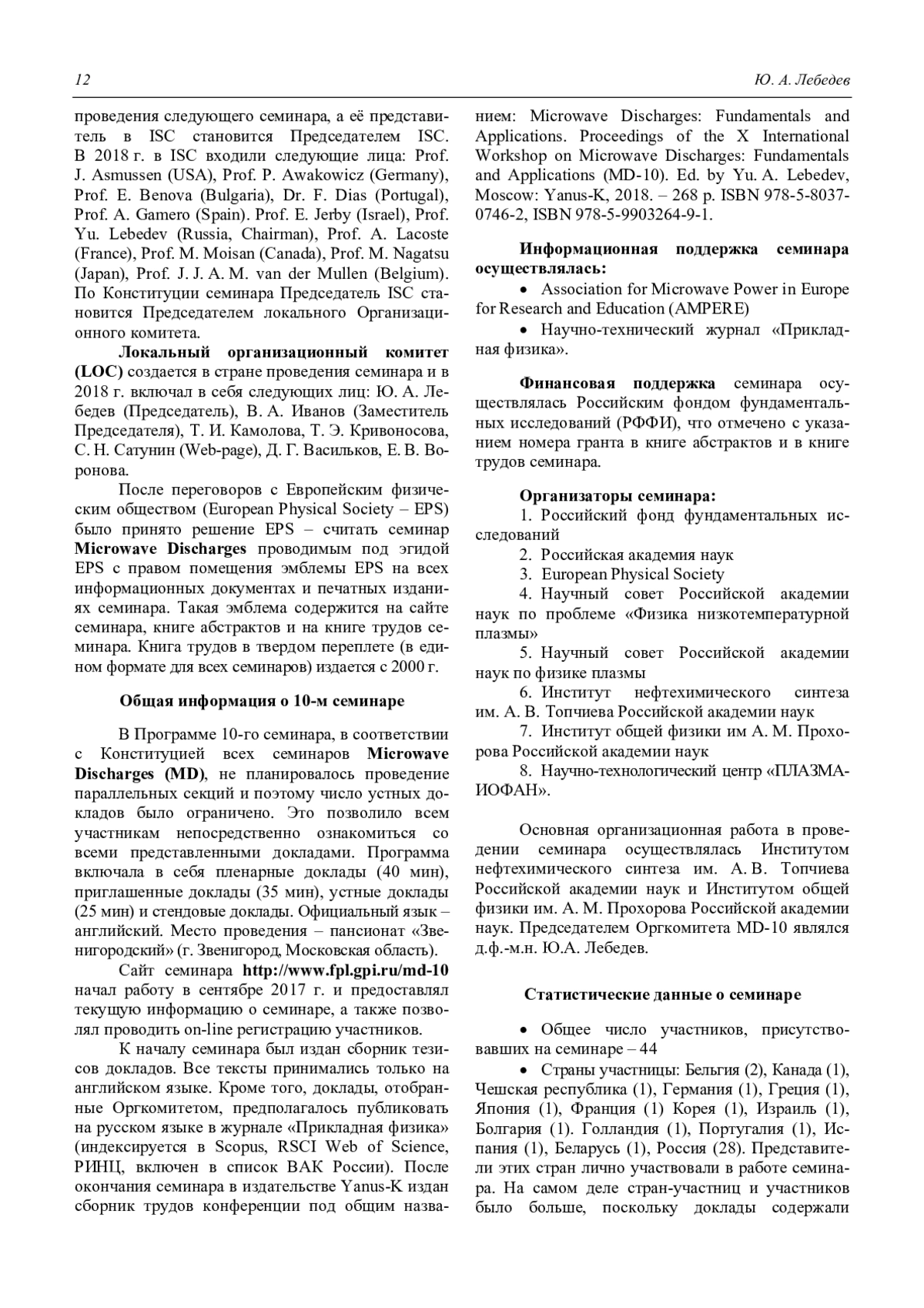 Лебедев Ю. А. 10-й Международный научный семинар по СВЧ-разрядам – X-th International Workshop on Micro-wave Discharges: Fundamentals and Applications (MD-10) 11