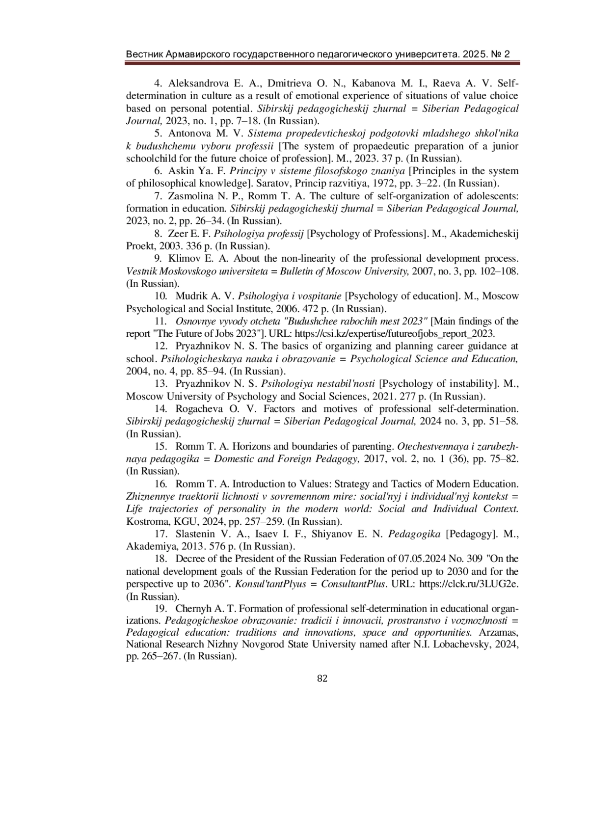 19. Черных, А. Т. Становление профессионального самоопределения в образовательных организациях / А. Т. Черных. - Текст: непосредственный // Педагогическое образование: традиции и инновации, пространство и возможности: сборник статей участников Международной научно-практической конференции, посвященной 90-летию педагогического образования в Арзамасе (г. Арзамас, 19-20 ноября 2024 года). - Арзамас: Национальный исследовательский Нижегородский государственный университет им. Н.И. Лобачевского, 2024. - С. 265-267. EDN: DJNWXQ
