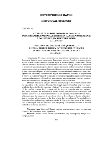 В статье анализируется российская пограничная политика на Северном Кавказе после ликвидации Крымского ханства, борьба с которым долгое время являлась консолидирующим фактором в русско-горских отношениях. Выясняются причины постепенного обострения конфликта между местными народами и имперской администрацией. Дается оценка движения шейха Мансура и влияния на него внутренних и внешних факторов. Демонстрируется роль военно-политической угрозы со стороны Персии, активизировавшей тенденцию на сближение части местных правителей с Россией, в которой они видели естественного союзника и покровителя в борьбе с внешней угрозой. Показаны постепенная трансформация политических подходов официального Петербурга в отношении населения края и переход от политики дипломатических договоров к силовым методам воздействия.