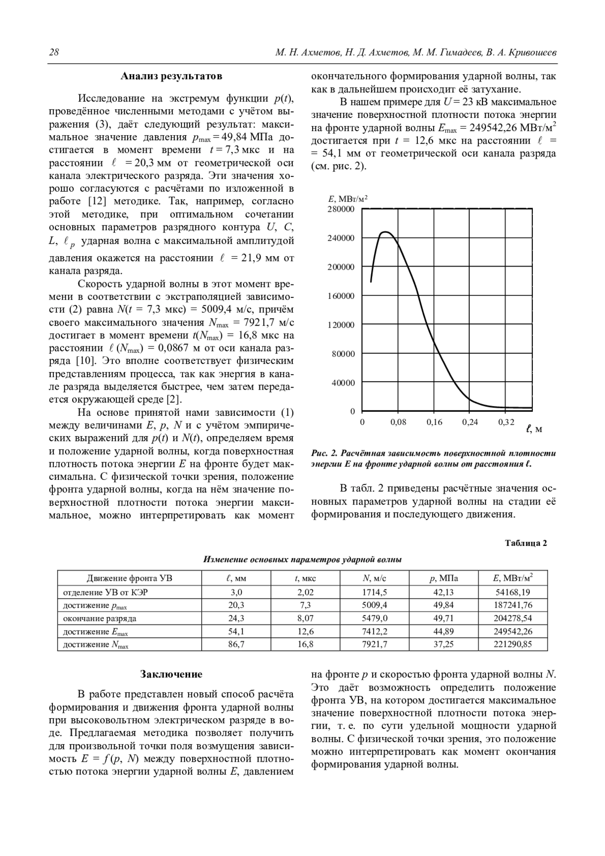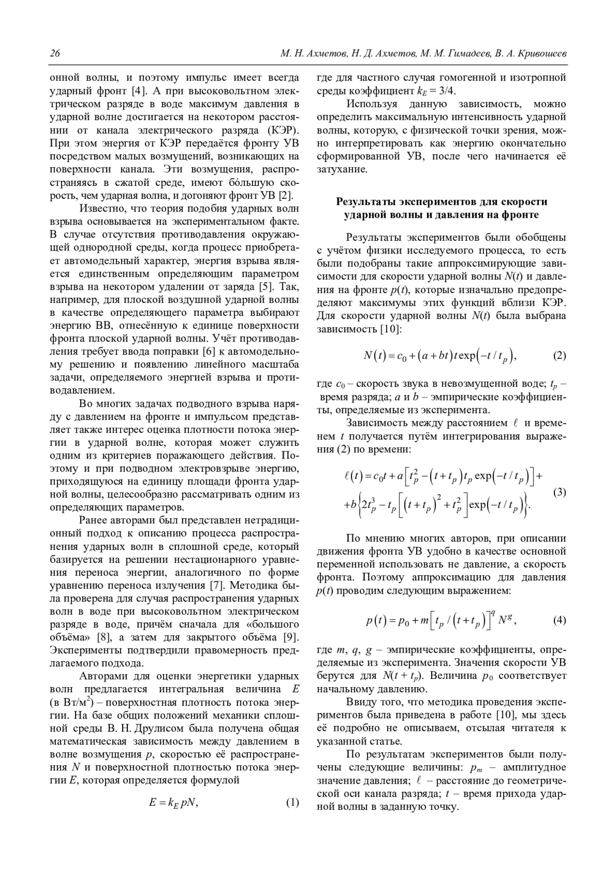 Ахметов М. Н., Ахметов Н. Д., Гимадеев М. М., Кривошеев В. А. Метод расчёта формирования и движения фронта ударной волны в высоковольтном электрическом разряде в воде 25