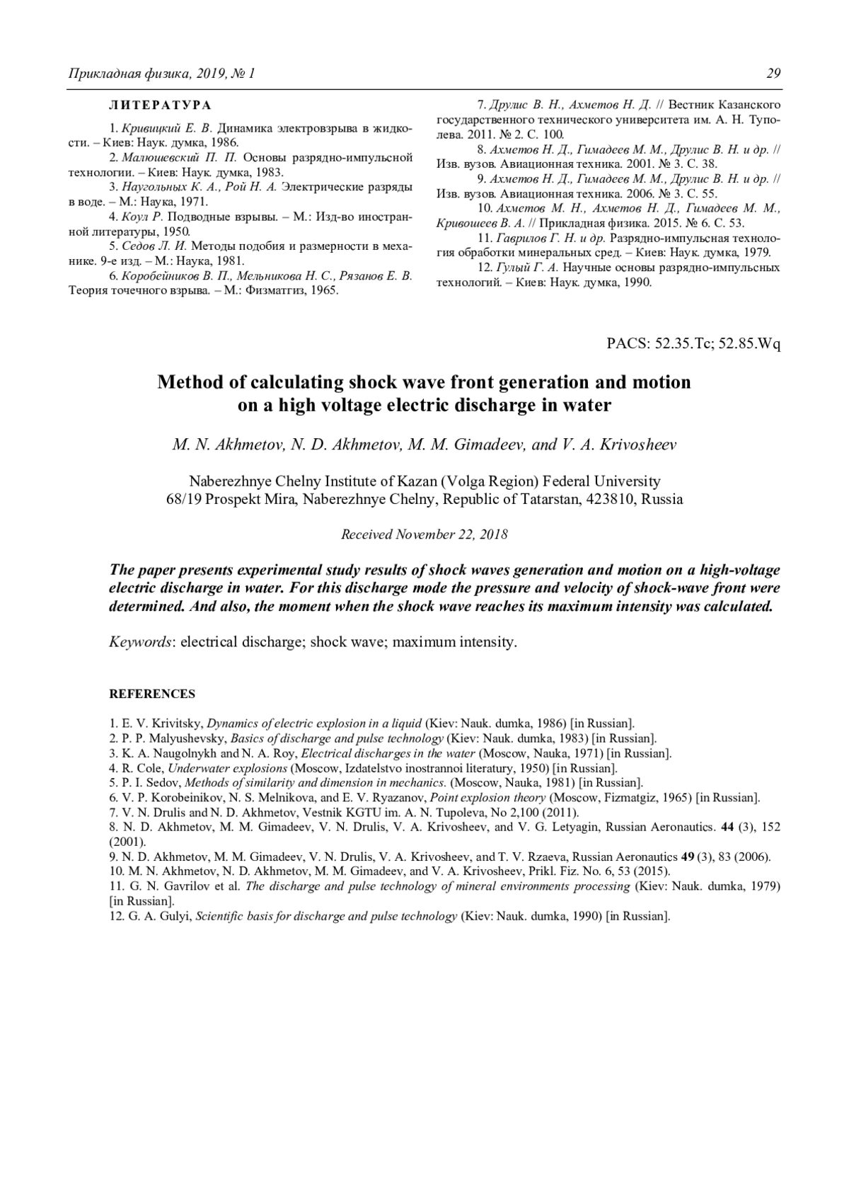 M. N. Akhmetov, N. D. Akhmetov, M. M. Gimadeev, and V. A. Krivosheev Method of calculating shock wave front generation and motion on a high voltage electric discharge in water 25