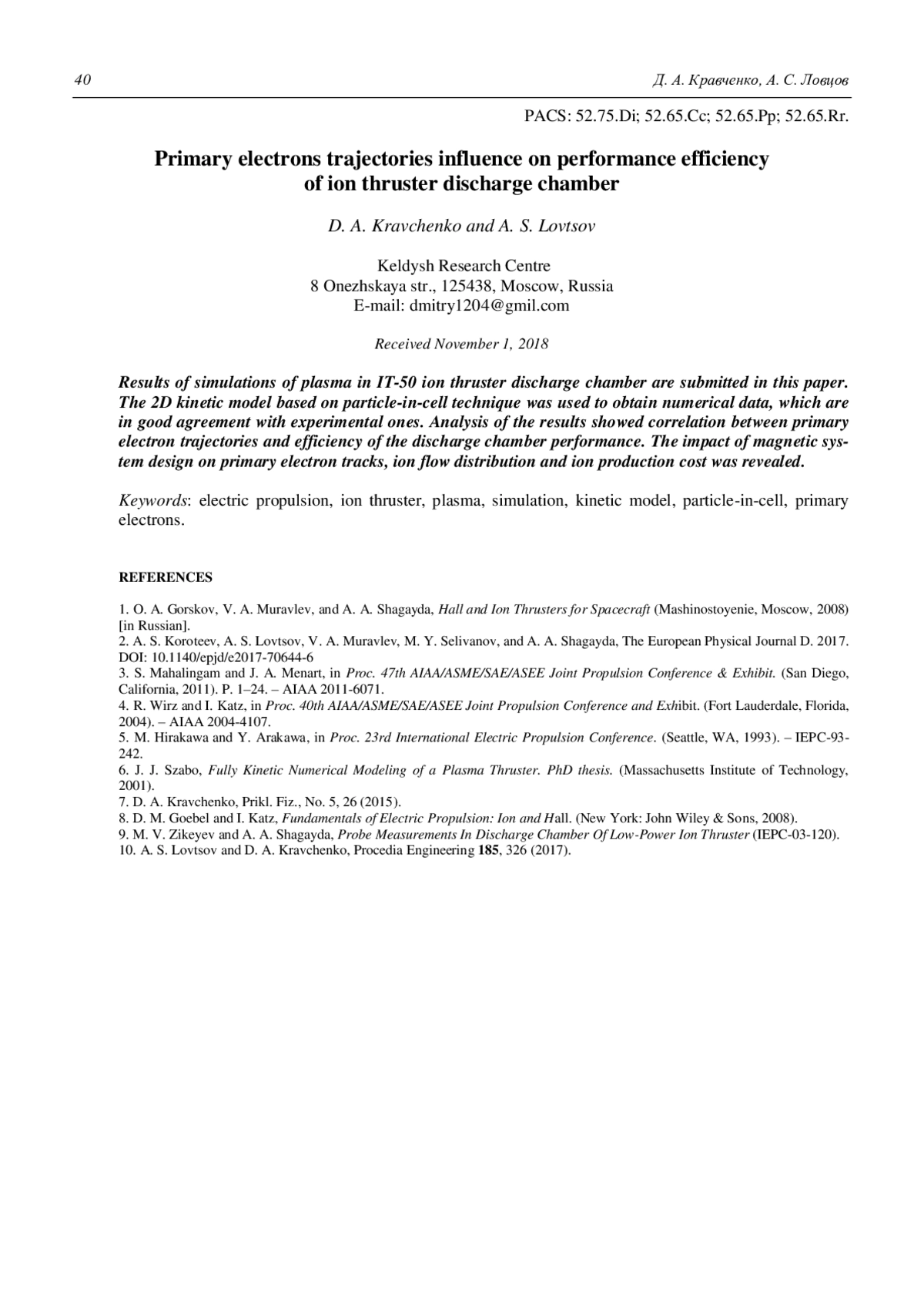 9. Zikeyev M. V., Shagayda A. A. Probe Measurements In Discharge Chamber Of Low-Power Ion Thruster, IEPC-03-120
