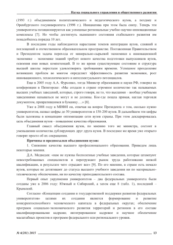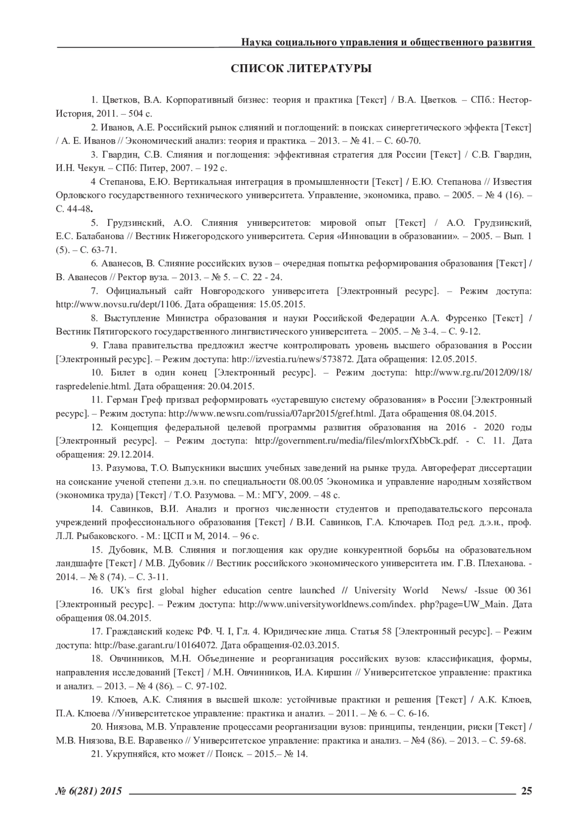 6. Аванесов, В. Слияние российских вузов -очередная попытка реформирования образования /В. Аванесов//Ректор вуза. -2013. -№ 5. -С. 22 -24. EDN: SLRGUR
