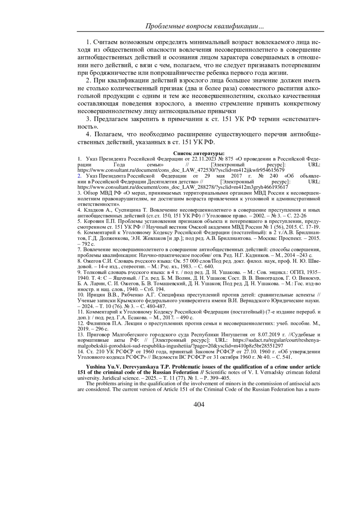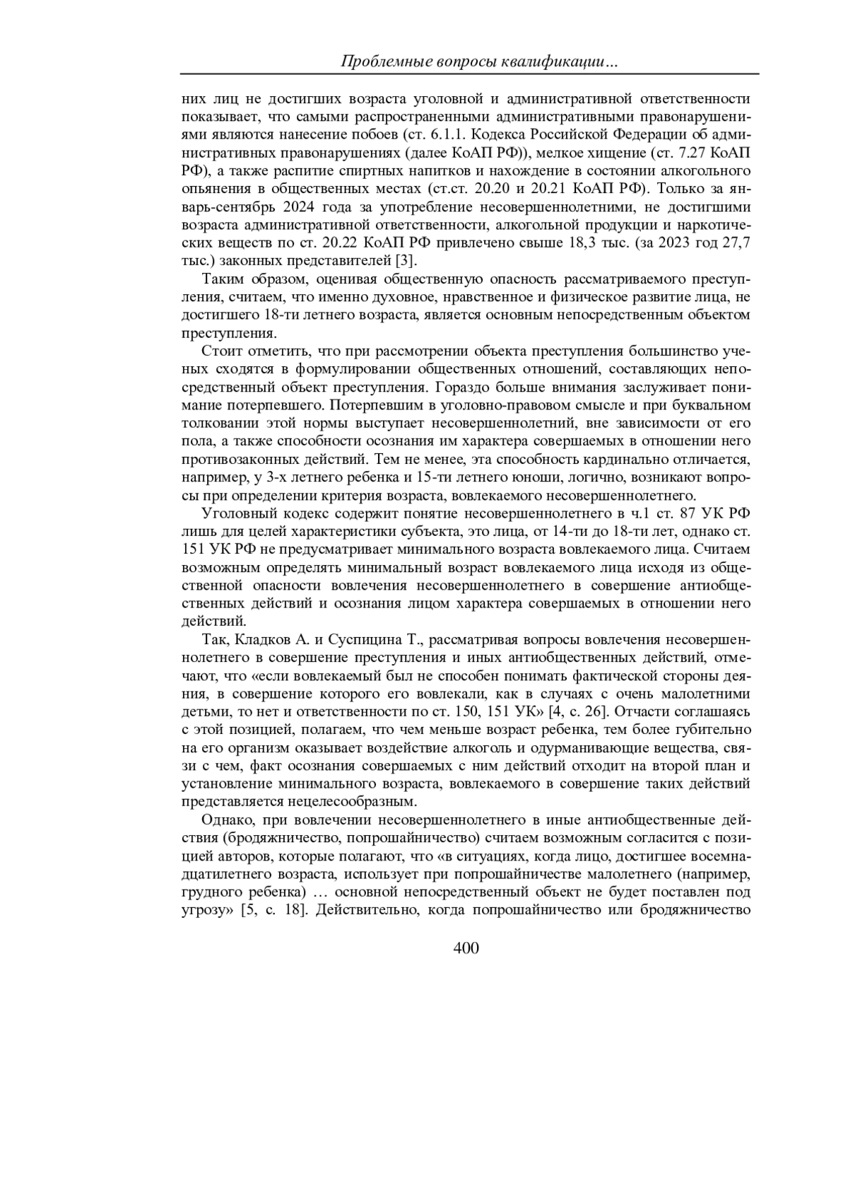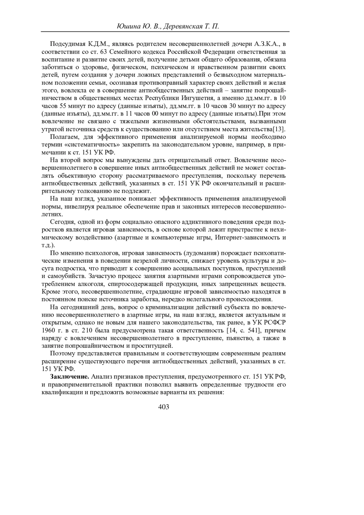 4. Кладков А., Суспицина Т. Вовлечение несовершеннолетнего в совершение преступления и иных антиобщественных действий (ст.ст. 150, 151 УК РФ) // Уголовное право. - 2002. - № 3. - С. 22-26.