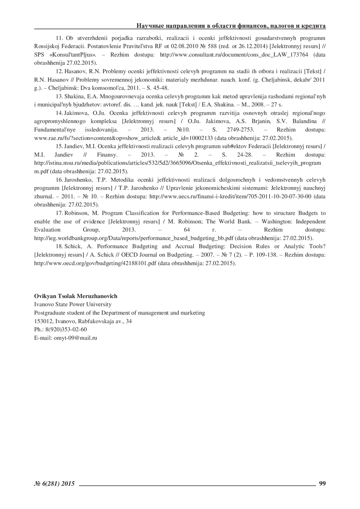 15. Яндиев, М.И. Оценка эффективности реализации целевых программ субъектов Федерации /М.И. Яндиев//Финансы. -2013. -№ 2. -С. 24-28. -Режим доступа: http://istina.msu.ru/media/publications/articles/532/5d2/3665096/Otsenka_effektivnosti_realizatsii_tselevyih_program m.pdf (дата обращения: 27.02.2015). EDN: PXRZTZ
