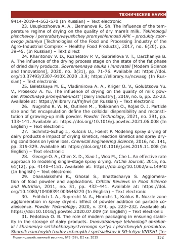 32. Fröhlich J. A., Ruprecht N. A., Hinrichs J., Kohlus R. Nozzle zone agglomeration in spray dryers: Effect of powder addition on particle coalescence. Powder Technology, 2020, v. 374, pp. 223-232. Available at: https:// (In English) - Text electronic. DOI: 10.1016/j.powtec.2020.07.009