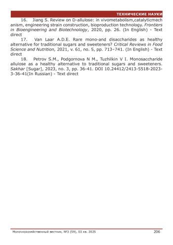 18. Петров, С.М. Моносахарид аллюлоза как здоровая альтернатива традиционным сахарам и подсластителям / С.М. Петров, Н.М. Подгорнова, В.И. Тужилкин // Сахар. - 2023. - № 3 - C. 36-41. -.