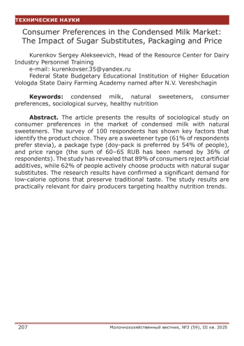 Представлены результаты социологического исследования потребительских предпочтений на рынке сгущенного молока с натуральными сахарозаменителями. На основе результатов опроса ста респондентов выявлены ключевые факторы, влияющие на выбор продукта: тип подсластителя (61 % предпочитают стевию), упаковка (дой-пак – 54 %) и ценовой диапазон (60–65 руб. – 36 %). Установлено, что 89 % потребителей негативно относятся к искусственным добавкам, а 62 % целенаправленно выбирают продукты с натуральными заменителями сахара. Исследование подтвердило высокий спрос на низкокалорийные решения, сохраняющие традиционный вкус. Результаты имеют практическую значимость для производителей молочной продукции, ориентированных на тренды здорового питания.