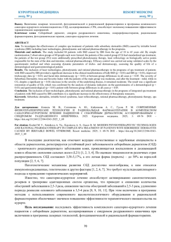 Цель исследования: исследовать эффективность комплексного санаторно-курортного лечения пациентов с себорейным дерматитом (СбД), ассоциированным с синдромом раздраженного кишечника (СРК) при включении в программы лазерных технологий, фотодинамической и рациональной фармакотерапии.