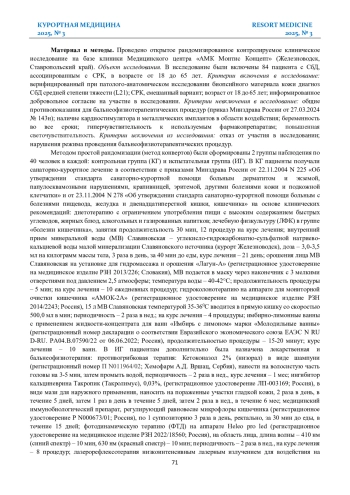 Материал и методы. В исследование отобраны 182 пациента сочинского санатория с верифицированными артериальной гипертензией (АГ), ишемической болезнью сердца (ИБС) и ХСНсФВ, средний возраст 60±2,7 года, которые были разделены на 2 равные группы по 91 человеку: группа сравнения (ГС) – АГ (n=57), ИБС (n=34); основная группа (ОГ) – АГ (n=53), ИБС (n=38). Пациенты ГС получали традиционное СКЛ, а пациенты ОГ – модифицированную немедикаментозную терапию (МНМТ), включающую персонализированное климатолечение, активизированную физическую активность и гидротерапию, оптимизированную диету, интервальную нормобарическую гипокситерапию (ИНГ), усиленную наружную контрпульсацию (УНКП), занятия в кардиошколе, психотерапевтическое воздействие.