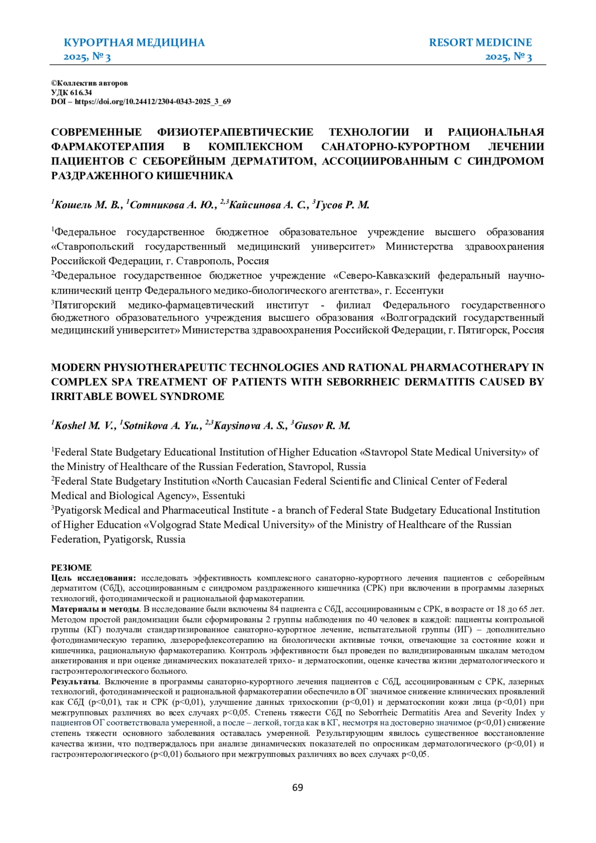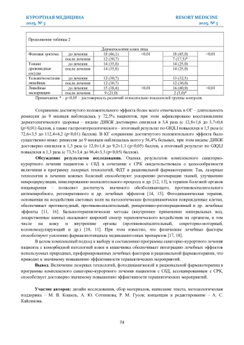 Вывод. Включение лазерных технологий, фотодинамической и рациональной фармакотерапии в программы комплексного санаторно-курортного лечения пациентов с СбД, ассоциированным с СРК, способствует значимому повышению эффективности терапевтических мероприятий.