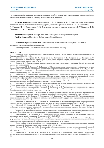 1. Ахмадзода М. А. Распространенность и интенсивность кариеса у детей. Вестник медико-социального института Таджикистана. 2022; 4(5): 16-27.