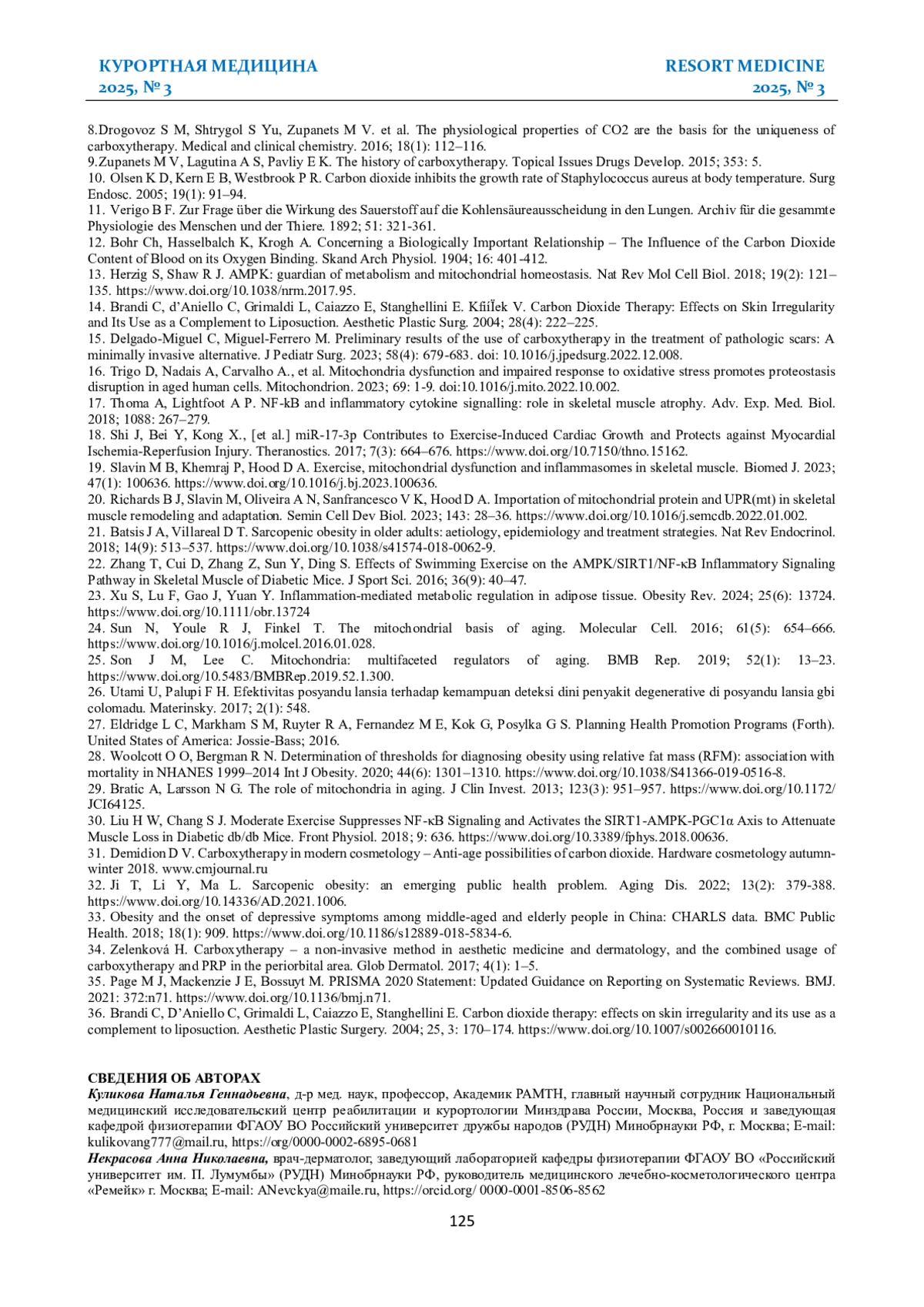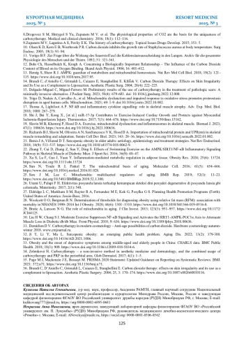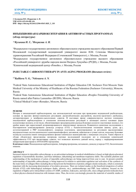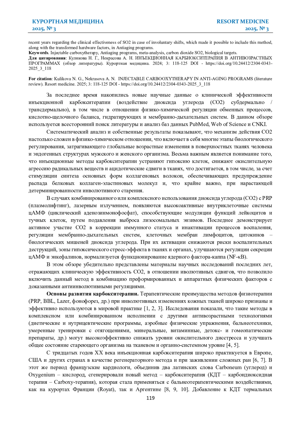 КУЛИКОВА Н. Г., НЕКРАСОВА А. Н. ИНЪЕКЦИОННАЯ КАРБИОКСИТЕРАПИЯ В АНТИВОЗРАСТНЫХ ПРОГРАММАХ // КУРОРТНАЯ МЕДИЦИНА. 2025. № 3