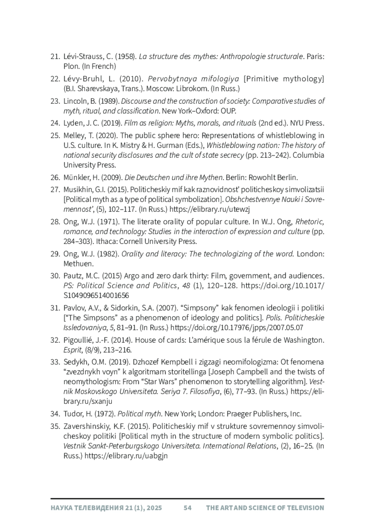 This article draws on the ideas of Alan Kirby, who in the 2000s proclaimed the advent of the digimodernist era dominated by visual narratives, and Walter Ong’s concept of secondary orality. It argues that advances in media technology and the saturation of everyday life with visual content contribute to the mythologization of political processes. The study focuses on American lms and TV series employing pseudodocumentary techniques, which foster viewers’ illusions of authenticity and depoliticized perception of ctional events. The analysis of political reality mythologization in American cinema is grounded in Joseph Campbell’s monomyth framework and structuralist theory, revealing persistent mythologemes that shape representations of politics in mass culture. Through Chiara Bottici’s and Benoît Challand’s theory of political myth, cinema is examined as a tool for crafting myths that reinforce and legitimize American political ideology. Despite their genre and stylistic diversity, American political lms and series form a cohesive structure, perpetuating core mythologemes that uphold democratic values and ideals. Key elements of this monomyth include: the sanctity of institutions and federalism, as well as the glori cation of journalists, officials, and ordinary citizens who expose state secrets in the name of justice. The corruption of individual politicians serves as a backdrop, highlighting processes such as elections and bipartisan compromise while advancing the notion of media’s vital role in holding power to account. The article concludes that the proliferation of cinematic political imagery in the late 20th century is connected with the growth of media influence and the development of Internet culture, providing unprecedented access to political information to the public. Viewers, immersed in screen culture, began to perceive cinema as a way to “observe” politics, thus building a demand for mythological constructs that simplify complex political dynamics.