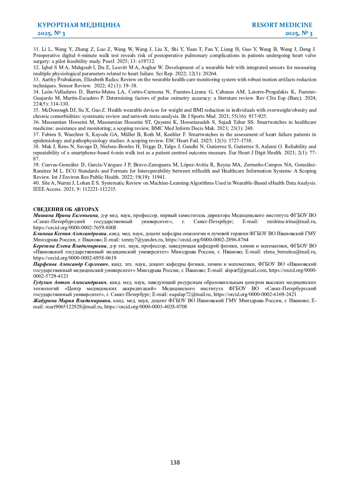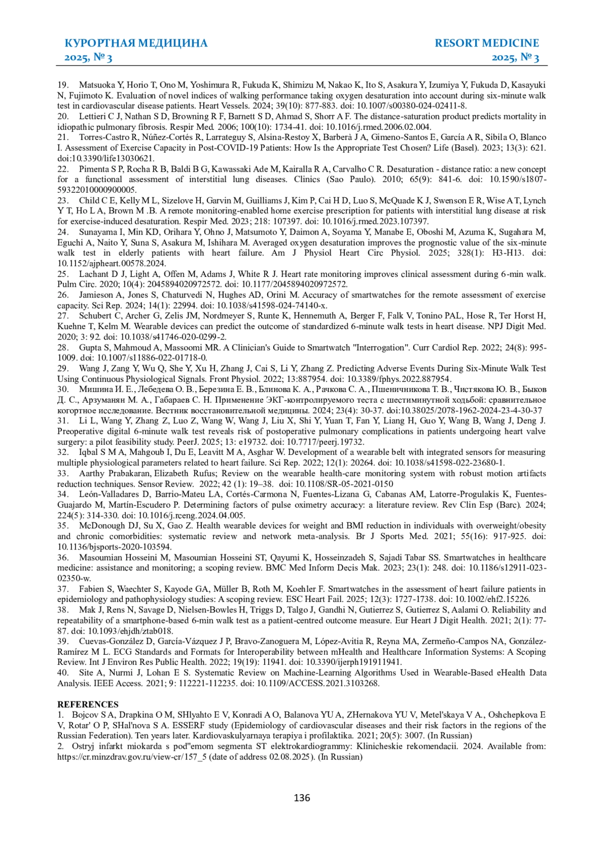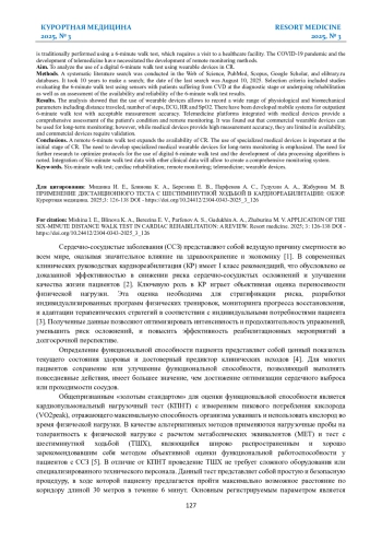 МИШИНА И. Е., БЛИНОВА К. А., БЕРЕЗИНА Е. В., ПАРФЕНОВ А. С., ГУДУХИН А. А., ЖАБУРИНА М. В. ПРИМЕНЕНИЕ ДИСТАНЦИОННОГО ТЕСТА С ШЕСТИМИНУТНОЙ ХОДЬБОЙ В КАРДИОРЕАБИЛИТАЦИИ: ОБЗОР // КУРОРТНАЯ МЕДИЦИНА. 2025. № 3