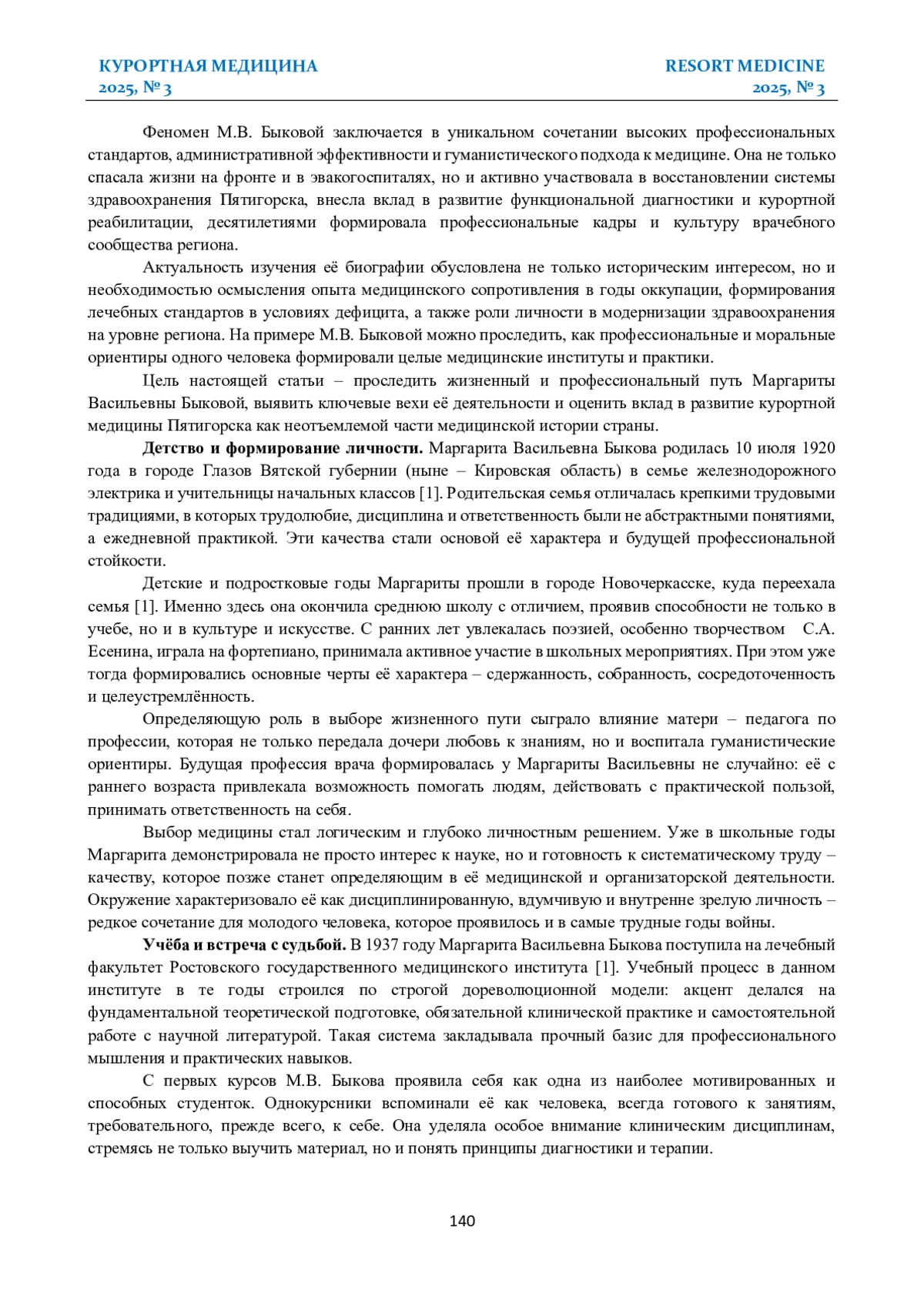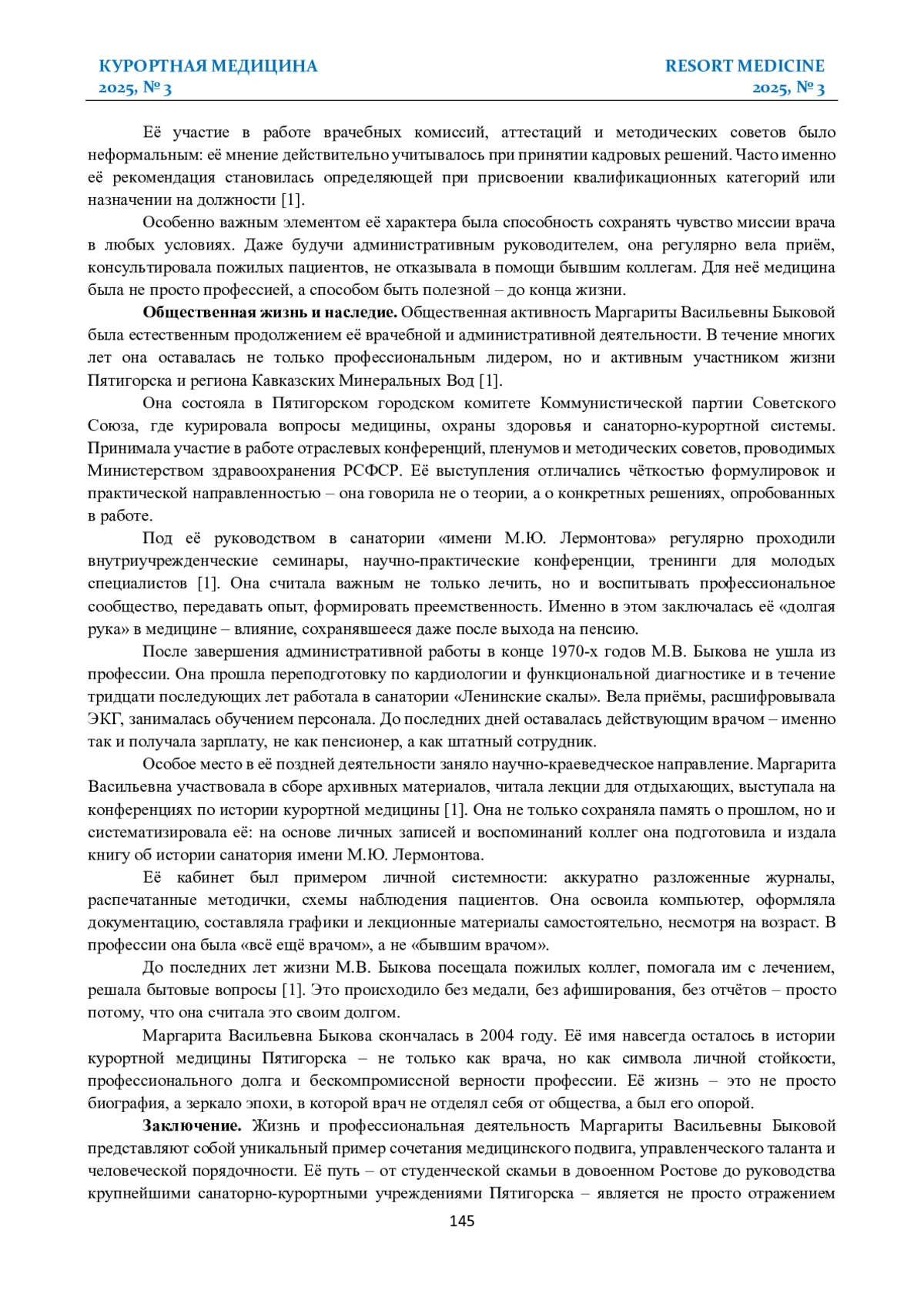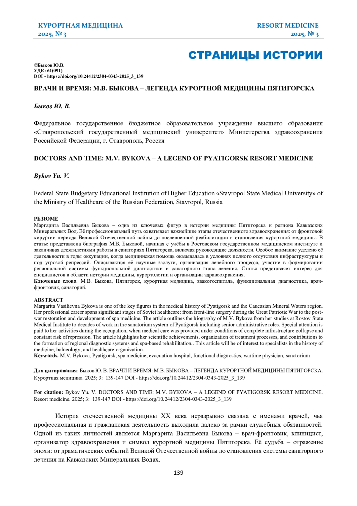 БЫКОВ Ю. В. ВРАЧИ И ВРЕМЯ: М. В. БЫКОВА – ЛЕГЕНДА КУРОРТНОЙ МЕДИЦИНЫ ПЯТИГОРСКА // КУРОРТНАЯ МЕДИЦИНА. 2025. № 3