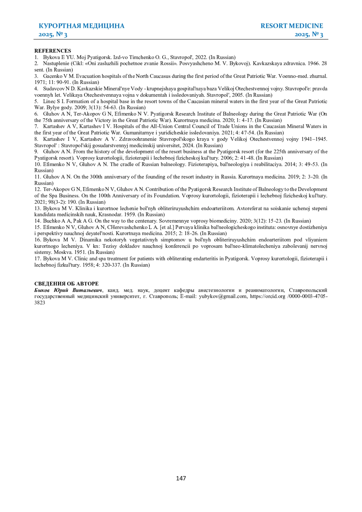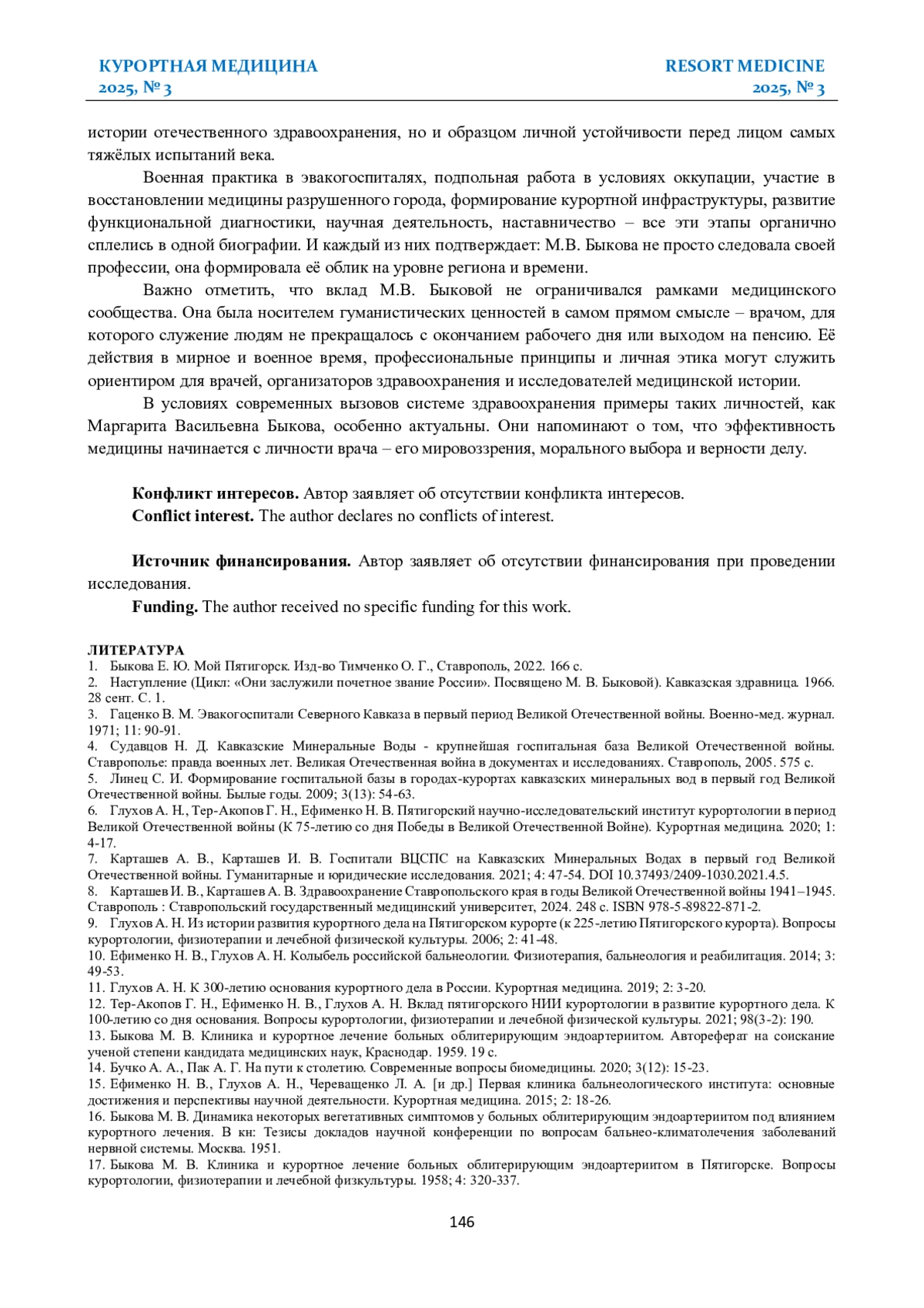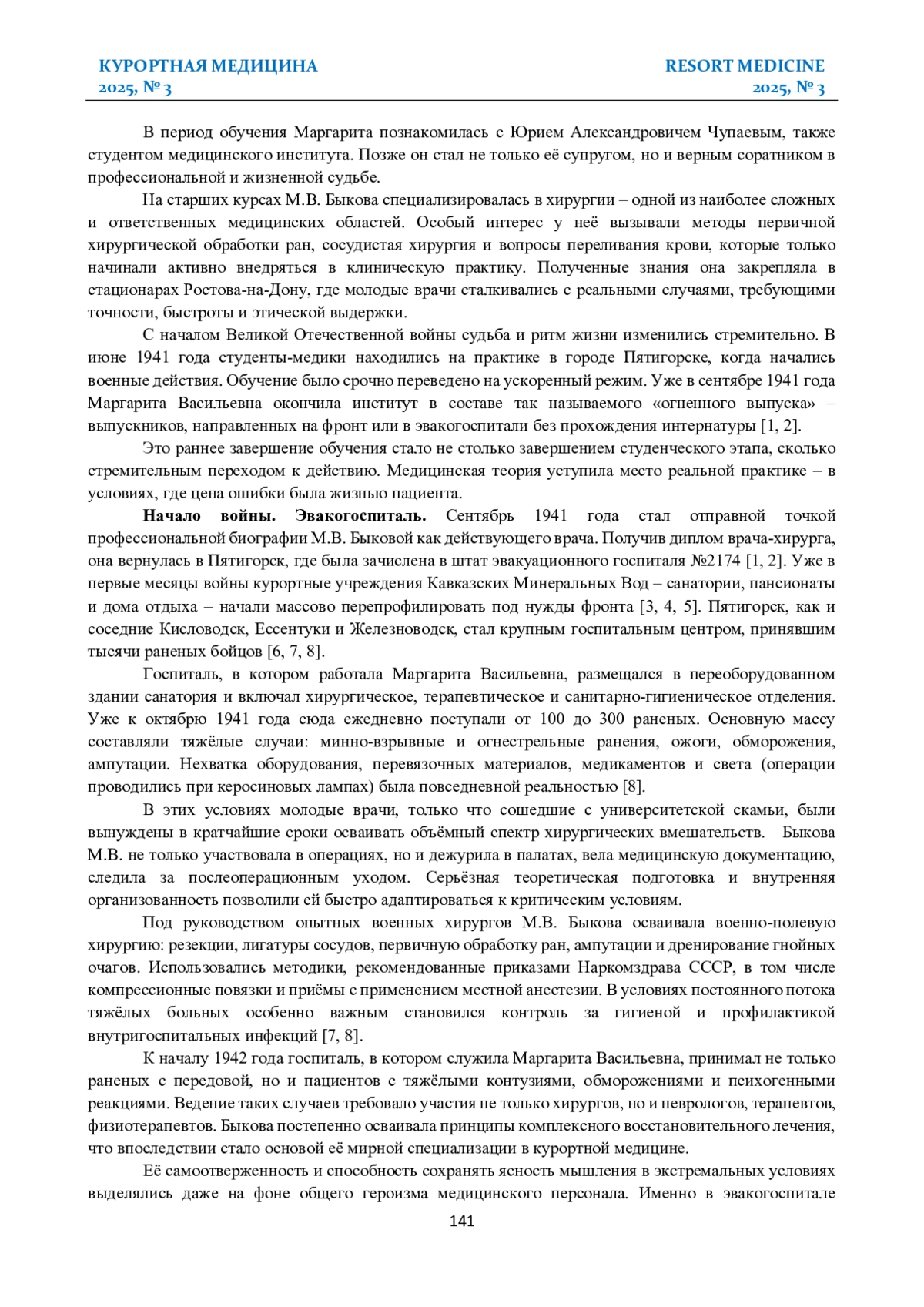 БЫКОВ Ю. В. ВРАЧИ И ВРЕМЯ: М. В. БЫКОВА – ЛЕГЕНДА КУРОРТНОЙ МЕДИЦИНЫ ПЯТИГОРСКА // КУРОРТНАЯ МЕДИЦИНА. 2025. № 3