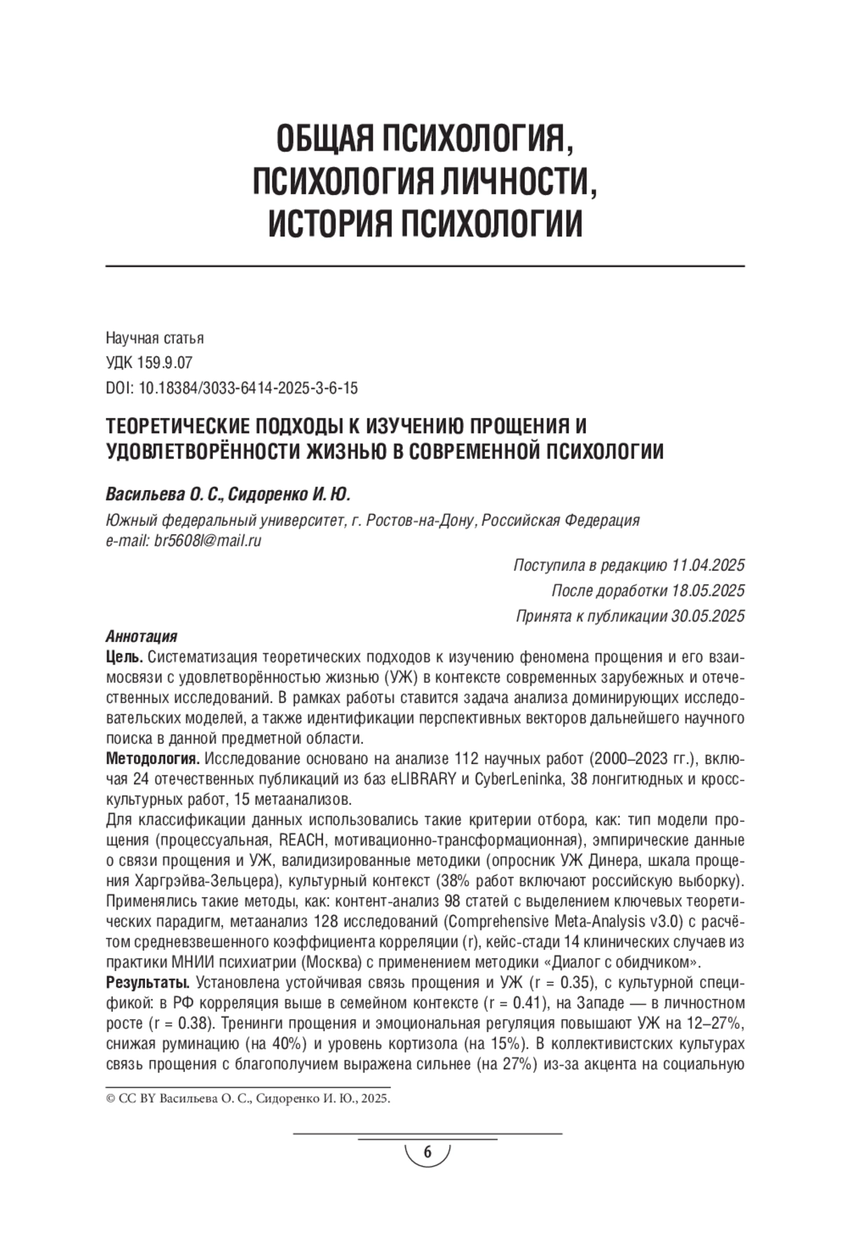 Методология. Исследование основано на анализе 112 научных работ (2000–2023 гг.), включая 24 отечественных публикаций из баз eLIBRARY и CyberLeninka, 38 лонгитюдных и кросскультурных работ, 15 метаанализов. Для классификации данных использовались такие критерии отбора, как: тип модели прощения (процессуальная, REACH, мотивационно-трансформационная), эмпирические данные о связи прощения и УЖ, валидизированные методики (опросник УЖ Динерa, шкала прощения Харгрэйва-Зельцера), культурный контекст (38% работ включают российскую выборку). Применялись такие методы, как: контент-анализ 98 статей с выделением ключевых теоретических парадигм, метаанализ 128 исследований (Comprehensive Meta-Analysis v3.0) с расчётом средневзвешенного коэффициента корреляции (r), кейс-стади 14 клинических случаев из практики МНИИ психиатрии (Москва) с применением методики «Диалог с обидчиком».