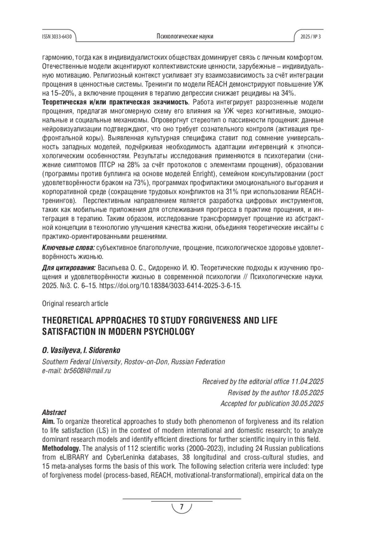 Цель. Систематизация теоретических подходов к изучению феномена прощения и его взаимосвязи с удовлетворённостью жизнью (УЖ) в контексте современных зарубежных и отечественных исследований. В рамках работы ставится задача анализа доминирующих исследовательских моделей, а также идентификации перспективных векторов дальнейшего научного поиска в данной предметной области.