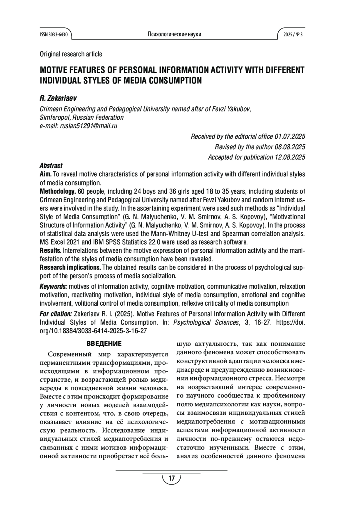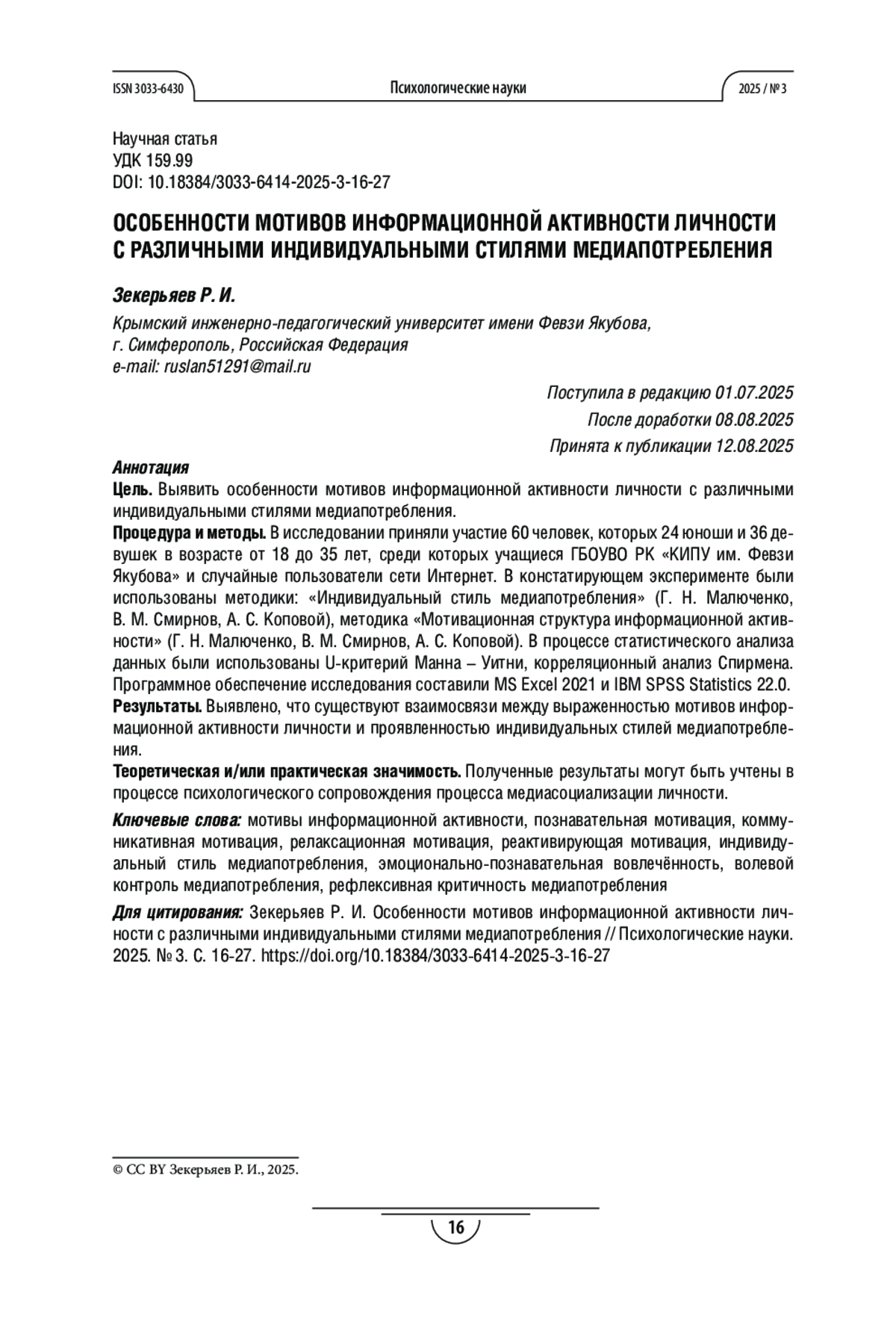 Процедура и методы. В исследовании приняли участие 60 человек, которых 24 юноши и 36 девушек в возрасте от 18 до 35 лет, среди которых учащиеся ГБОУВО РК «КИПУ им. Февзи Якубова» и случайные пользователи сети Интернет. В констатирующем эксперименте были использованы методики: «Индивидуальный стиль медиапотребления» (Г. Н. Малюченко, В. М. Смирнов, А. С. Коповой), методика «Мотивационная структура информационной активности» (Г. Н. Малюченко, В. М. Смирнов, А. С. Коповой). В процессе статистического анализа данных были использованы U-критерий Манна – Уитни, корреляционный анализ Спирмена. Программное обеспечение исследования составили MS Excel 2021 и IBM SPSS Statistics 22.0.