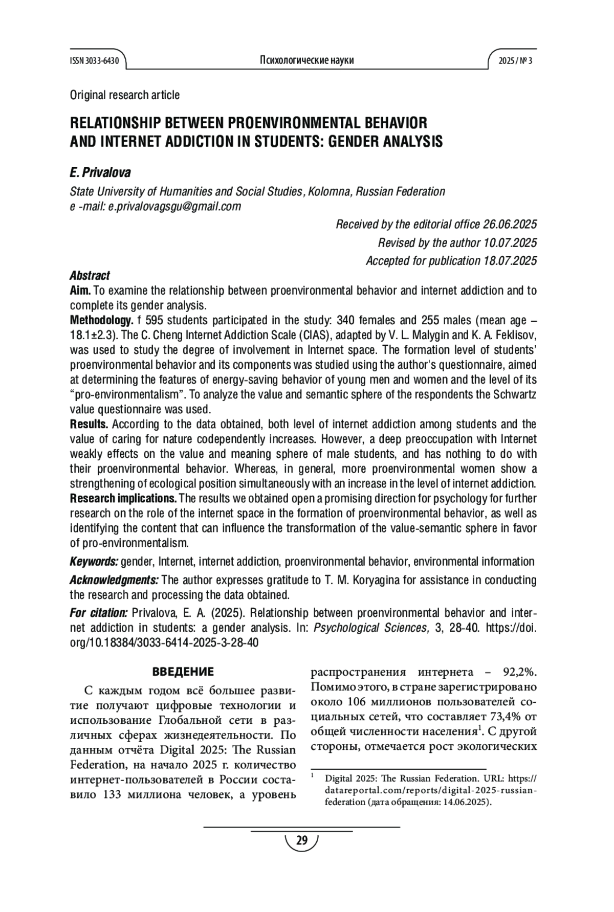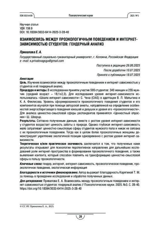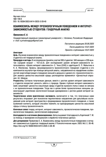 Цель. Изучение взаимосвязи между проэкологичным поведением и интернет-зависимостью у студентов и её гендерный анализ.
