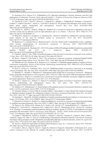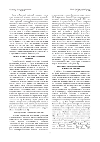 Acinetobacter baumannii – один из самых часто инфекционных агентов, выявляемых во всем мире, важными особенностями которых являются высокая частота мутаций, приводящая к быстрому развитию антибиотикорезистентности, и устойчивость к дезинфекции. В данном обзоре представлены сведения о значимости этого патогена в инфекционной патологии, механизмах, лежащих в основе заболеваний, связанных с A. baumannii, факторах вирулентности, множественной лекарственной устойчивости возбудителя, его резистентности к агрессивным факторам внешней среды, приёмах, используемых патогеном для колонизации и заражения организма человека, факторах риска развития инфекции, клинических формах вызываемых им заболеваний. Обсужден выбор препаратов для терапии инфекций, обусловленных A. baumannii. Проведен поиск и анализ отечественных и зарубежных научных публикаций с использованием поисковых систем электронных библиотек – eLIBRARY. ru, PubMed, Google Scholar, КиберЛенинка.