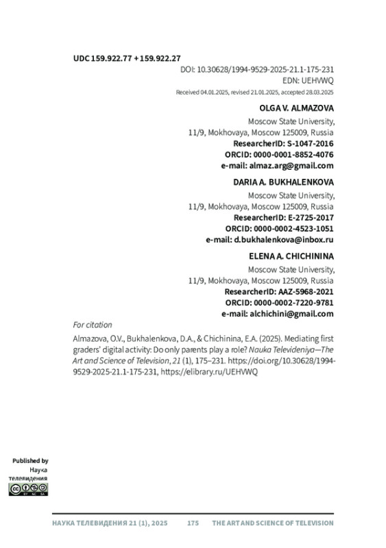 11. Руднова, Н.А., Корниенко, Д.С., Волкова, Е.Н., Исаева, О.М. (2023). Цифровая родительская медиация и ее связь с показателями психологического благополучия детей школьного возраста. Наука телевидения, 19 (1), 175-198. ,. DOI: 10.30628/1994-9529-2023-19.1-175-198 EDN: RBDUZW
