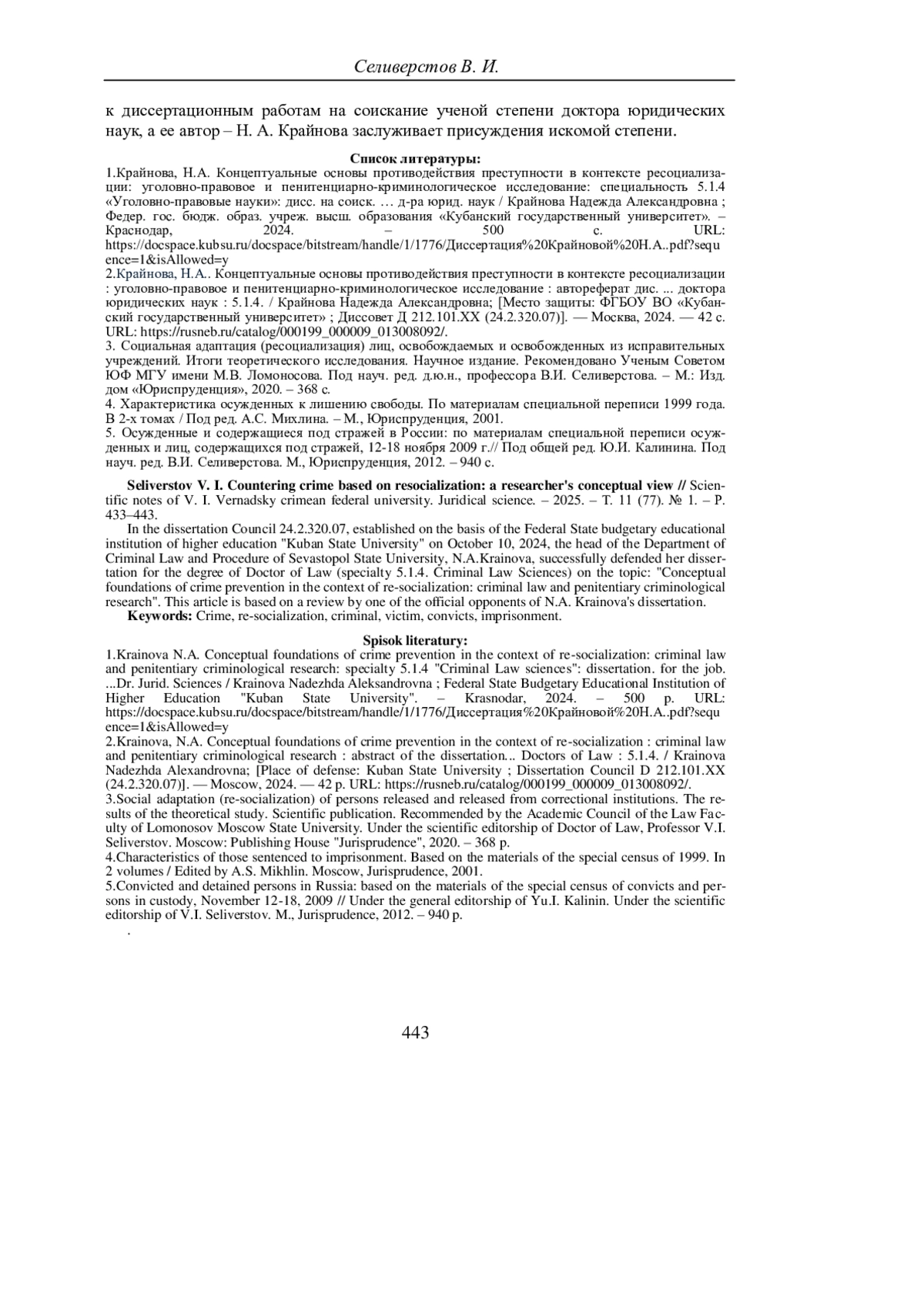 СЕЛИВЕРСТОВ В. И. ПРОТИВОДЕЙСТВИЕ ПРЕСТУПНОСТИ С ОПОРОЙ НА РЕСОЦИАЛИЗАЦИЮ: КОНЦЕПТУАЛЬНЫЙ ВЗГЛЯД ИССЛЕДОВАТЕЛЯ // УЧЕНЫЕ ЗАПИСКИ КРЫМСКОГО ФЕДЕРАЛЬНОГО УНИВЕРСИТЕТА ИМЕНИ В. И. ВЕРНАДСКОГО. ЮРИДИЧЕСКИЕ НАУКИ. 2025. ТОМ 11(77). №1