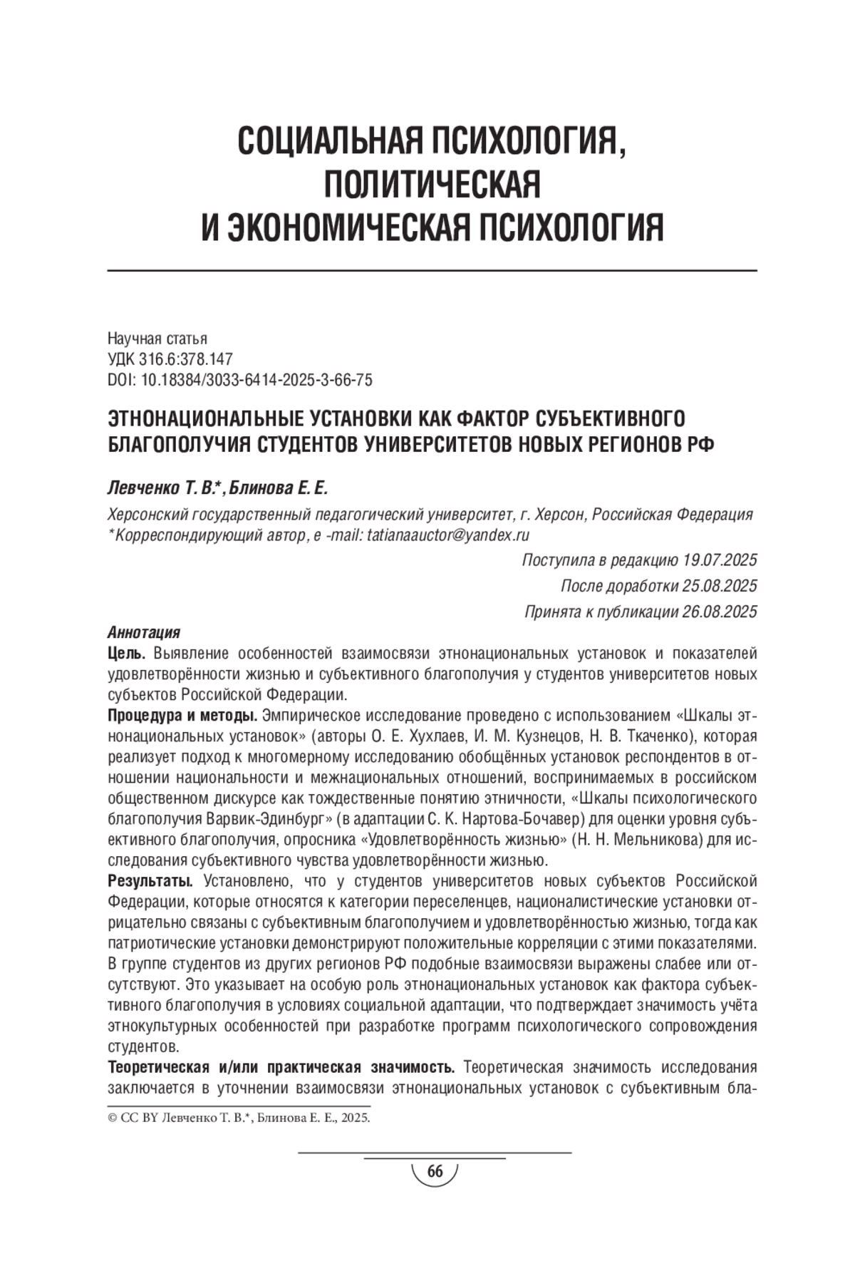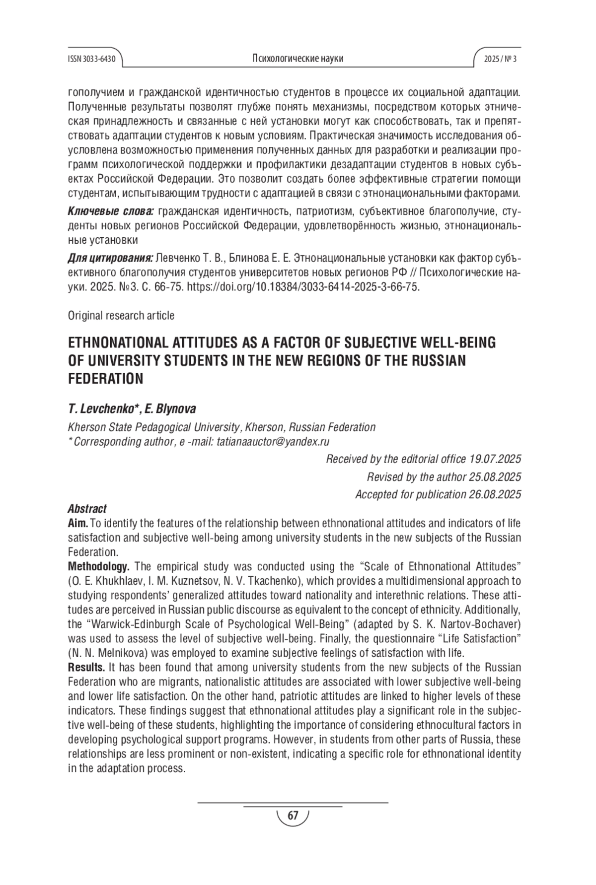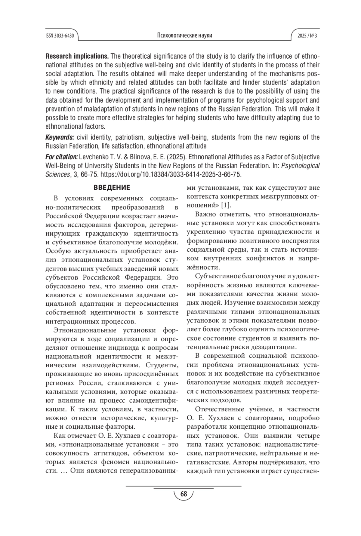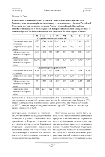 ЛЕВЧЕНКО Т. В., БЛИНОВА (. Е. ЭТНОНАЦИОНАЛЬНЫЕ УСТАНОВКИ КАК ФАКТОР СУБЪЕКТИВНОГО БЛАГОПОЛУЧИЯ СТУДЕНТОВ УНИВЕРСИТЕТОВ НОВЫХ РЕГИОНОВ РФ // ПСИХОЛОГИЧЕСКИЕ НАУКИ. 2025. № 3