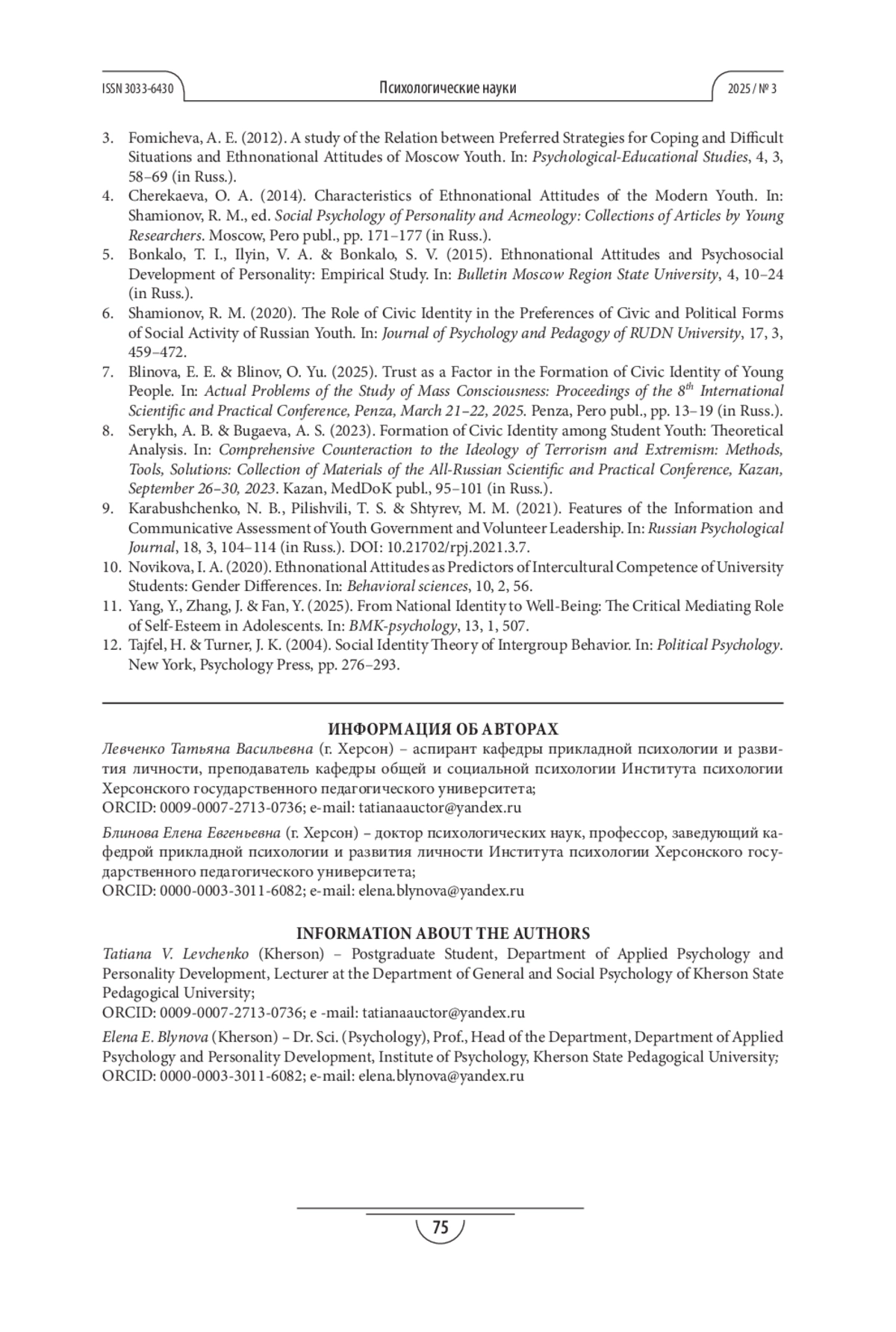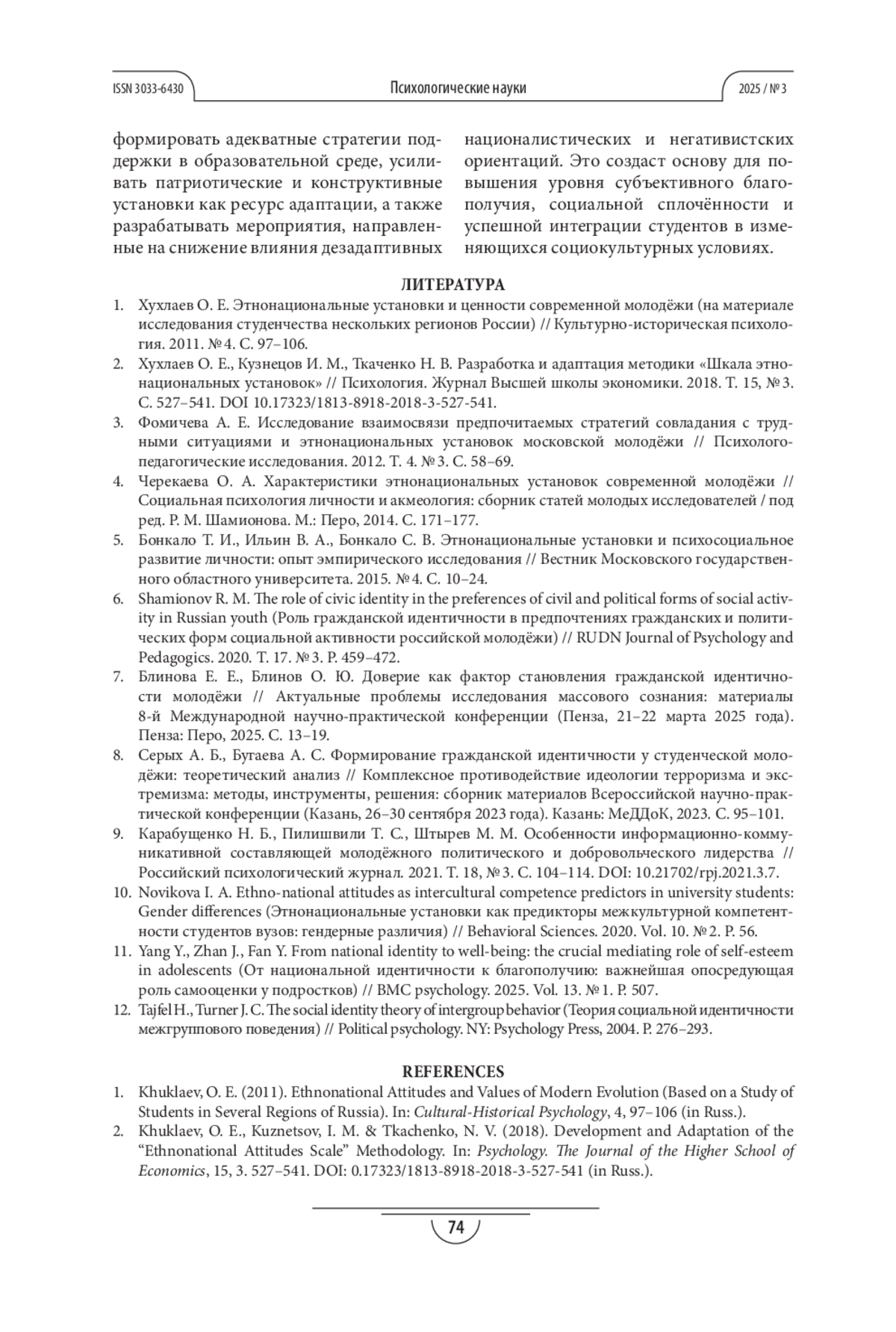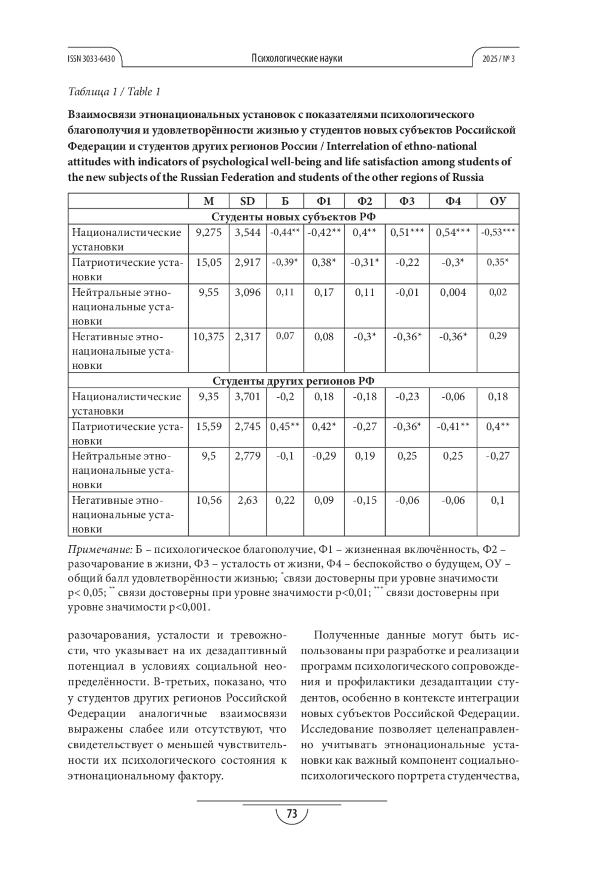 ЛЕВЧЕНКО Т. В., БЛИНОВА (. Е. ЭТНОНАЦИОНАЛЬНЫЕ УСТАНОВКИ КАК ФАКТОР СУБЪЕКТИВНОГО БЛАГОПОЛУЧИЯ СТУДЕНТОВ УНИВЕРСИТЕТОВ НОВЫХ РЕГИОНОВ РФ // ПСИХОЛОГИЧЕСКИЕ НАУКИ. 2025. № 3