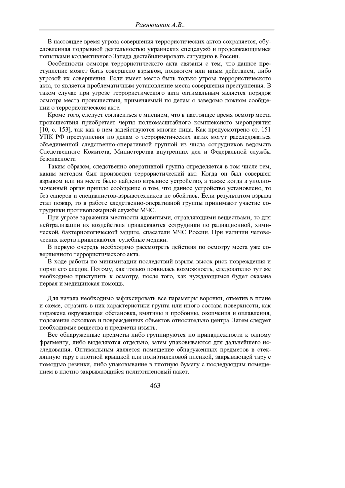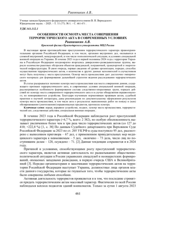 РАВНЮШКИН А. В. ОСОБЕННОСТИ ОСМОТРА МЕСТА СОВЕРШЕНИЯ ТЕРРОРИСТИЧЕСКОГО АКТА В СОВРЕМЕННЫХ УСЛОВИЯХ // УЧЕНЫЕ ЗАПИСКИ КРЫМСКОГО ФЕДЕРАЛЬНОГО УНИВЕРСИТЕТА ИМЕНИ В. И. ВЕРНАДСКОГО. ЮРИДИЧЕСКИЕ НАУКИ. 2025. ТОМ 11(77). №1