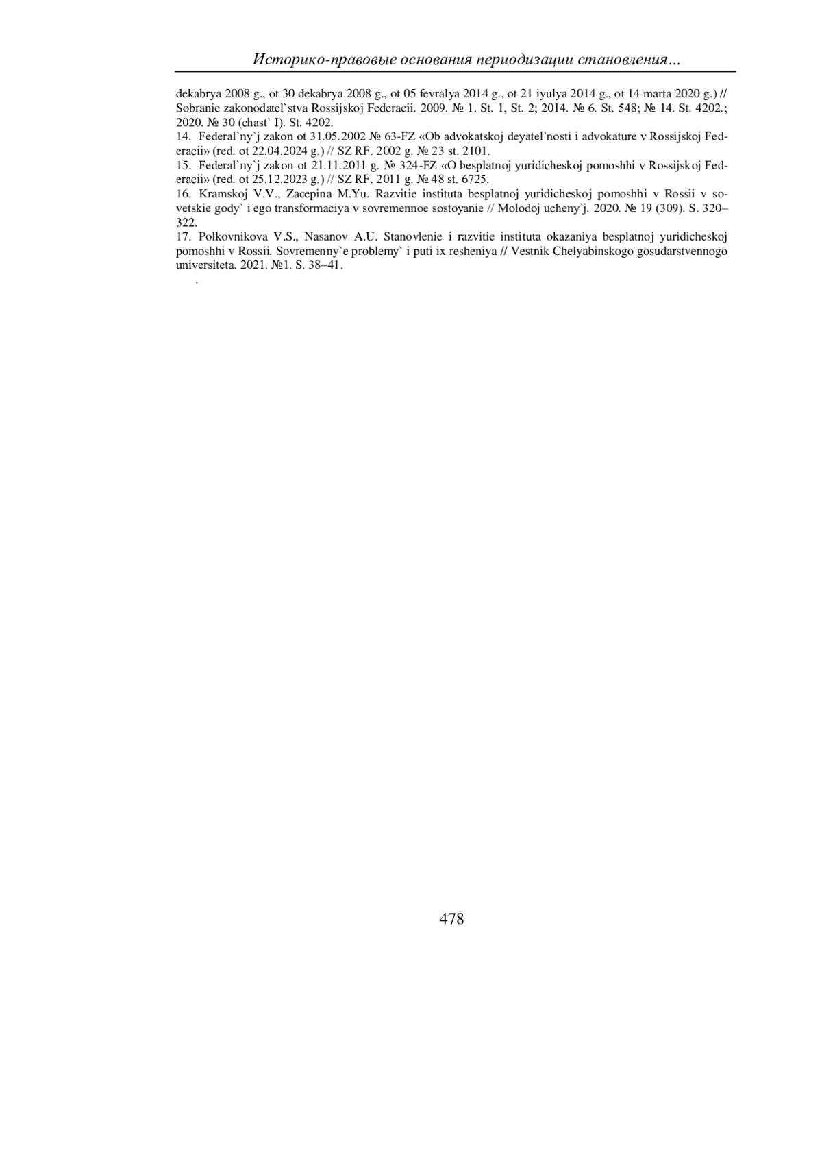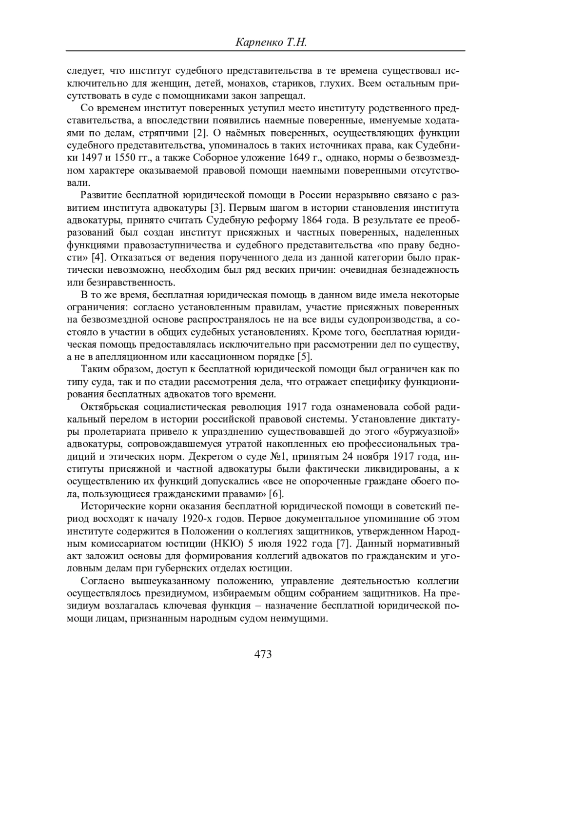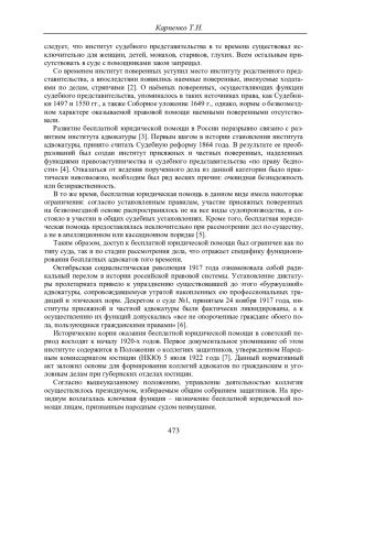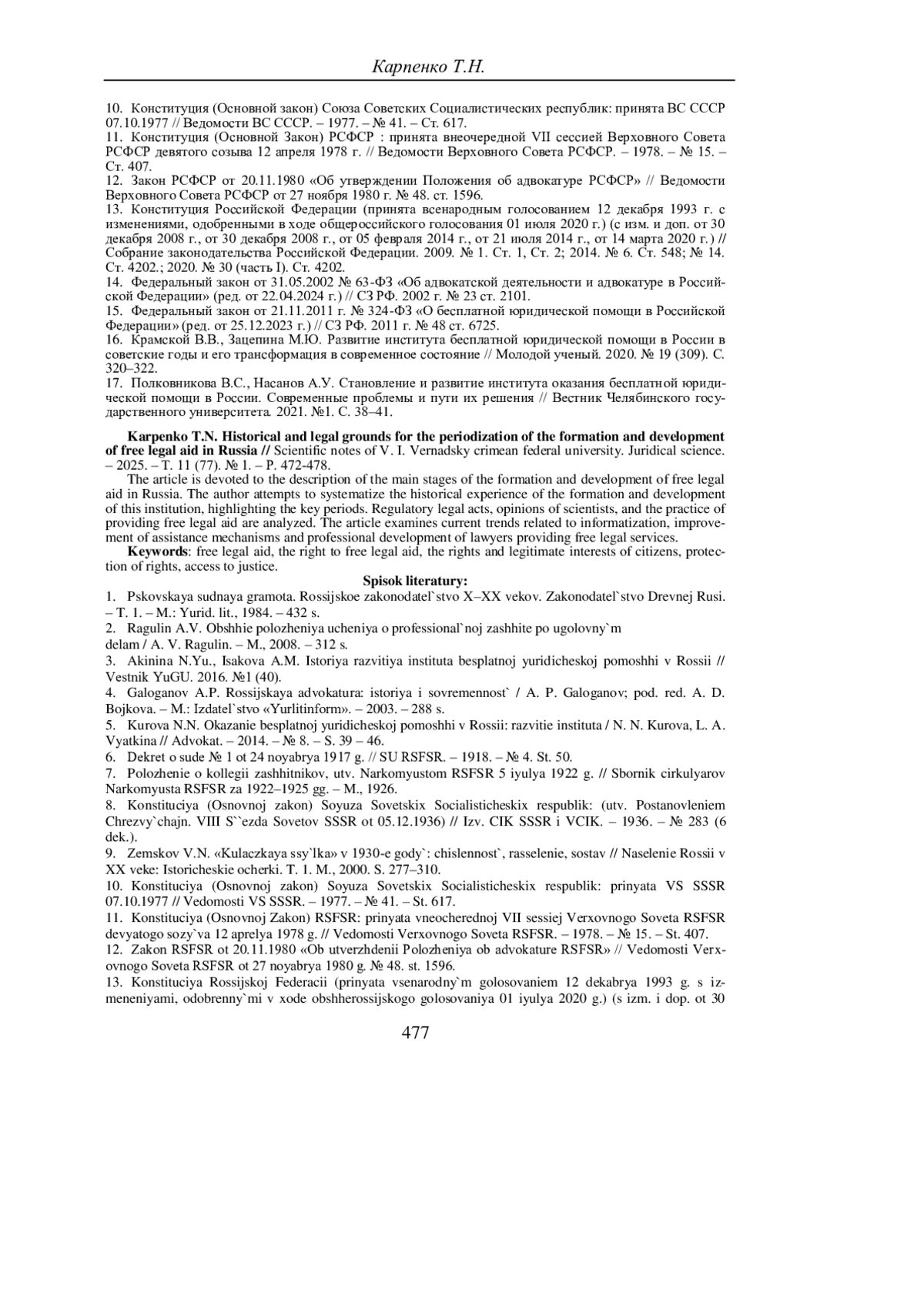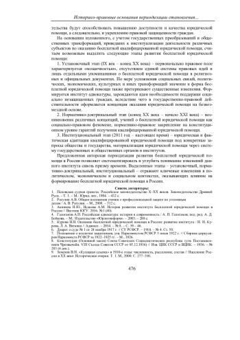 КАРПЕНКО Т. Н. ИСТОРИКО-ПРАВОВЫЕ ОСНОВАНИЯ ПЕРИОДИЗАЦИИ СТАНОВЛЕНИЯ И РАЗВИТИЯ БЕСПЛАТНОЙ ЮРИДИЧЕСКОЙ ПОМОЩИ В РОССИИ // УЧЕНЫЕ ЗАПИСКИ КРЫМСКОГО ФЕДЕРАЛЬНОГО УНИВЕРСИТЕТА ИМЕНИ В. И. ВЕРНАДСКОГО. ЮРИДИЧЕСКИЕ НАУКИ. 2025. ТОМ 11(77). №1