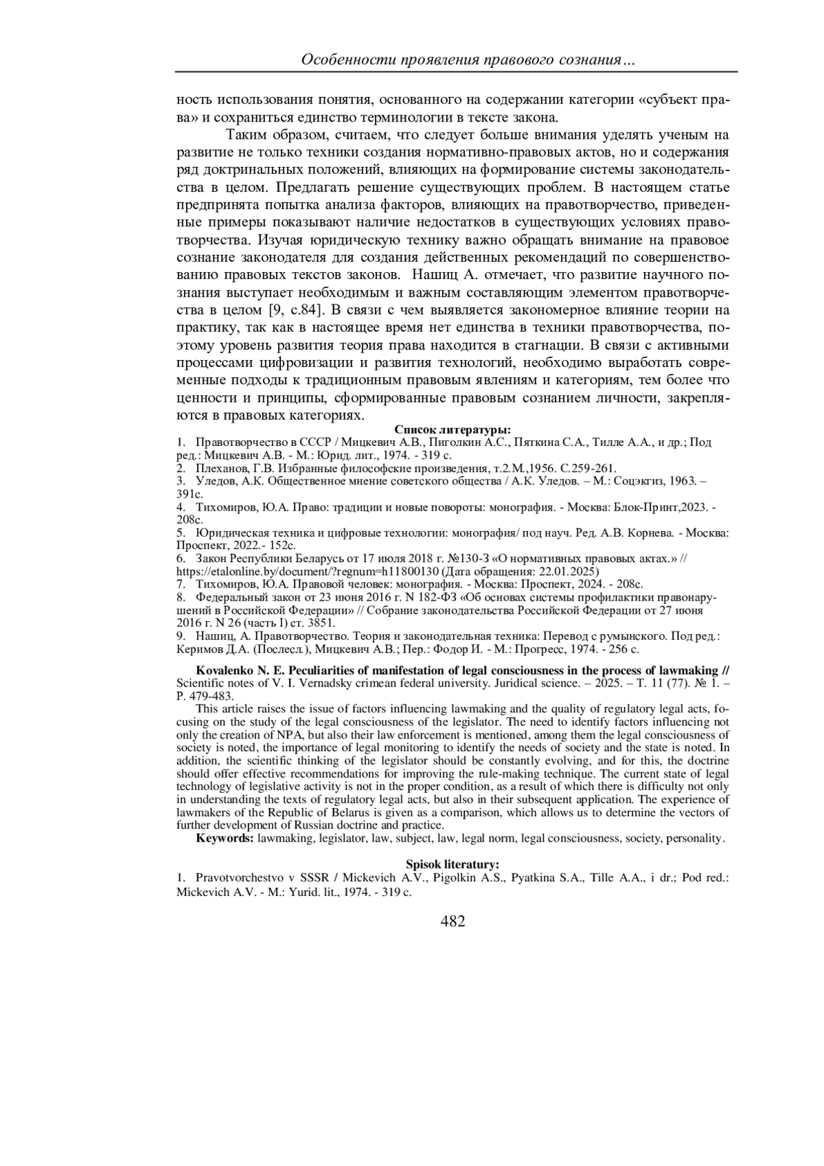 КОВАЛЕНКО Н. Е. ОСОБЕННОСТИ ПРОЯВЛЕНИЯ ПРАВОВОГО СОЗНАНИЯ В ПРОЦЕССЕ ПРАВОТВОРЧЕСТВА // УЧЕНЫЕ ЗАПИСКИ КРЫМСКОГО ФЕДЕРАЛЬНОГО УНИВЕРСИТЕТА ИМЕНИ В. И. ВЕРНАДСКОГО. ЮРИДИЧЕСКИЕ НАУКИ. 2025. ТОМ 11(77). №1