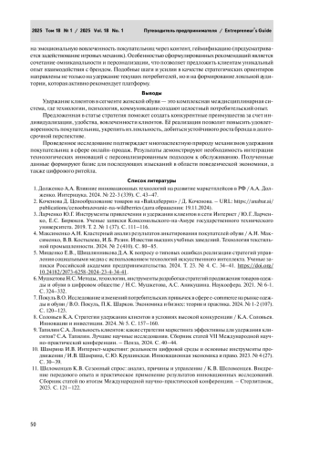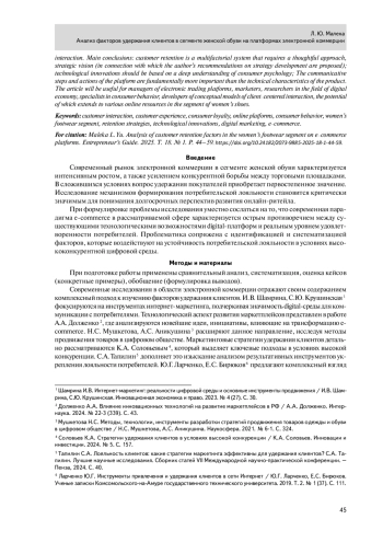 МАЛЕКА Л. Ю. АНАЛИЗ ФАКТОРОВ УДЕРЖАНИЯ КЛИЕНТОВ В СЕГМЕНТЕ ЖЕНСКОЙ ОБУВИ НА ПЛАТФОРМАХ ЭЛЕКТРОННОЙ КОММЕРЦИИ // РОССИЙСКАЯ АКАДЕМИЯ ПРЕДПРИНИМАТЕЛЬСТВА. 2025. Т. 18, № 1