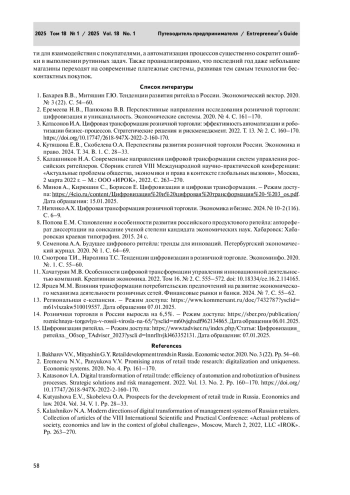 2. Еремеева Н.В., Панюкова В.В. Перспективные направления исследования розничной торговли: цифровизация и униканальность. Экономические системы. 2020. № 4. С. 161-170.