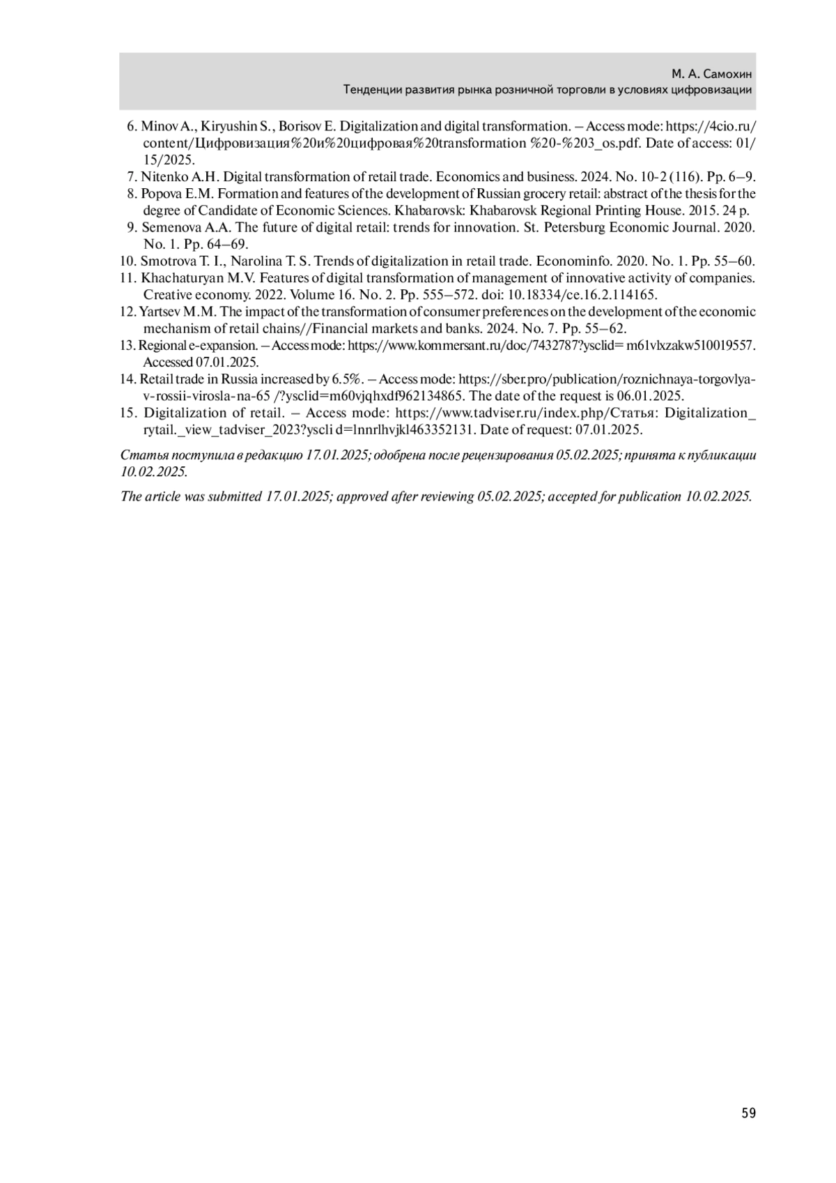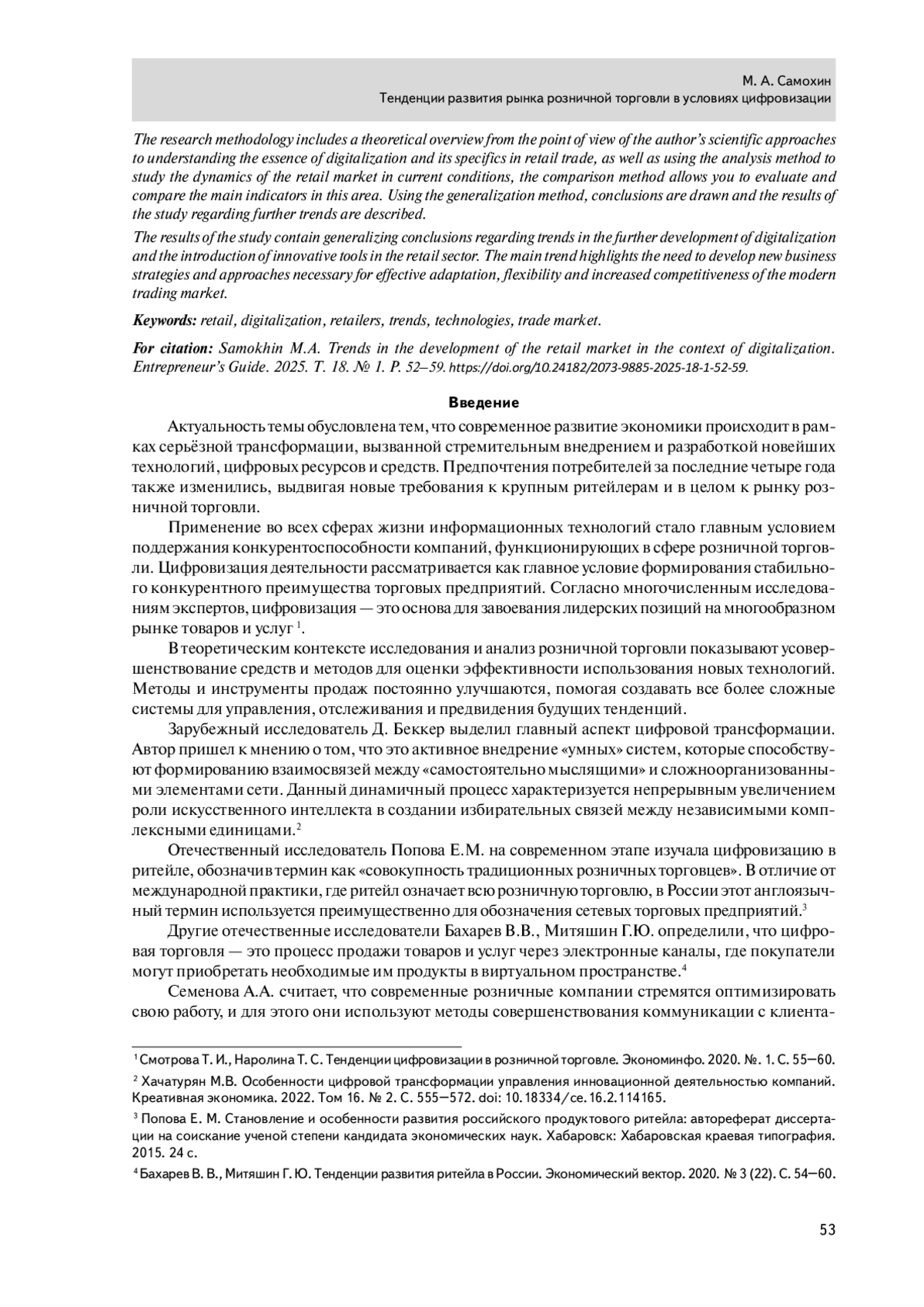 10. Смотрова Т.И., Наролина Т.С. Тенденции цифровизации в розничной торговле. Экономинфо. 2020. №. 1. С. 55-60.