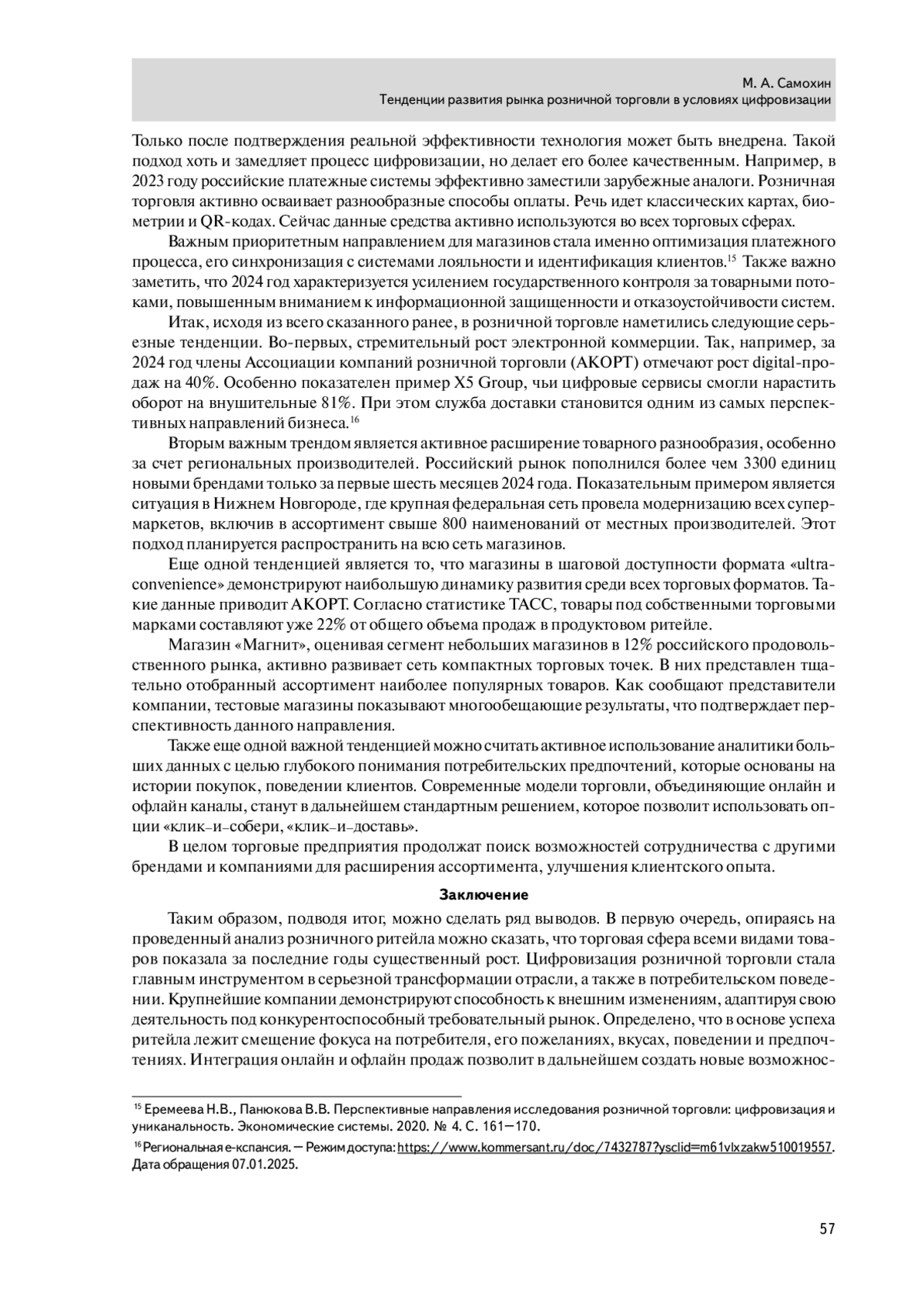 14. Розничная торговля в России выросла на 6,5%. - Режим доступа: https://sber.pro/publication/roznichnaya-torgovlya-v-rossii-virosla-na-65/?ysclid=m60vjqhxdf962134865. Дата обращения 06.01.2025.