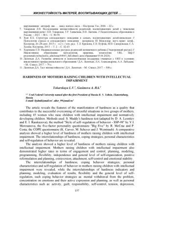 Статья раскрывает особенности проявления жизнестойкости, как качества, способствующего успешному преодолению стрессовых ситуаций на двух группах матерей, включающих 45 женщин, которые воспитывают детей с интеллектуальными нарушениями и нормативно развивающихся детей. Использованные методики: тест жизнестойкости С. Мадди (в адаптации Леонтьева Д. А. и Рассказовой Е. И.), методика «Стиль саморегуляции поведения - ССП-98» Моросановой В. И., пятифакторный личностный опросник «Большая пятерка» МакКрае Р. и Коста П.; опросник COPE (Карвера К., Шейера М. и Вейнтрауба Дж.). Сравнительной анализ показал более высокий уровень жизнестойкости матерей, воспитывающих детей с интеллектуальными нарушениями. Выявлены взаимосвязи жизнестойкости, стратегий совладающего поведения, личностных особенностей и саморегуляции поведения. Полученные данные могут быть использованы при проектировании психокоррекционных программы для матерей, воспитывающих детей с ограниченными возможностями здоровья.